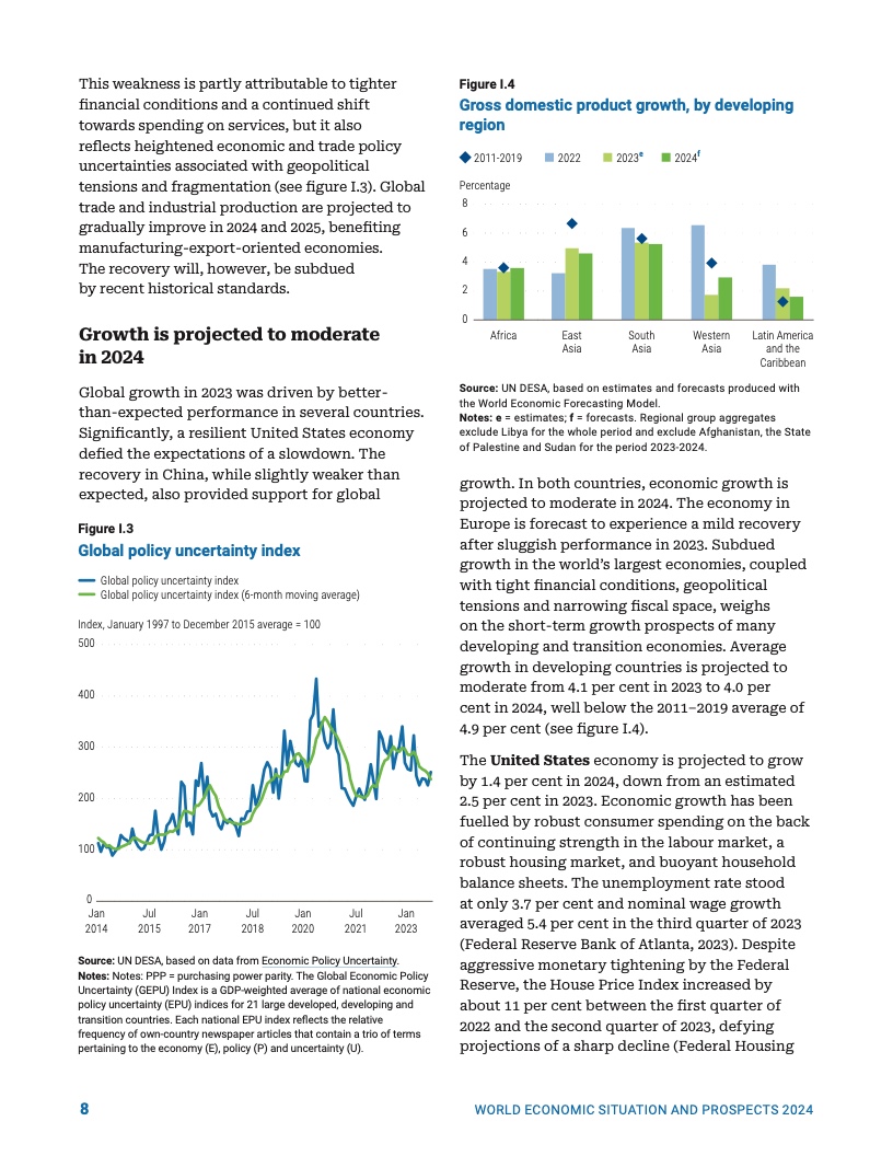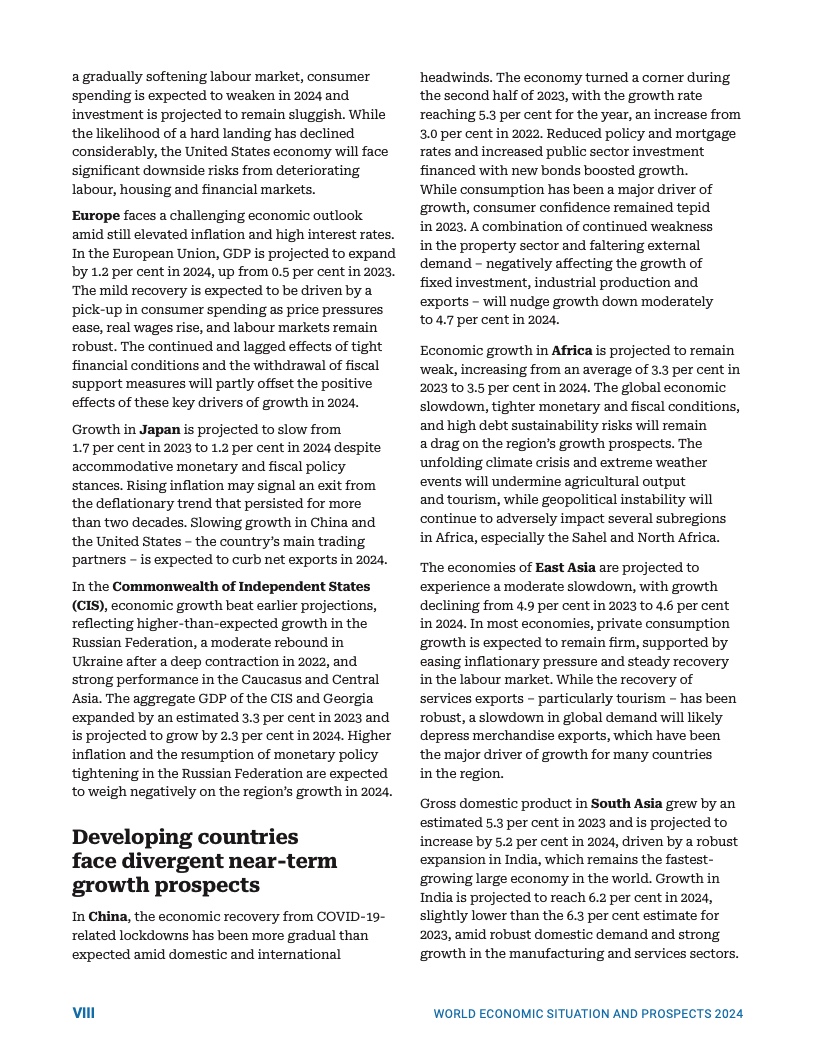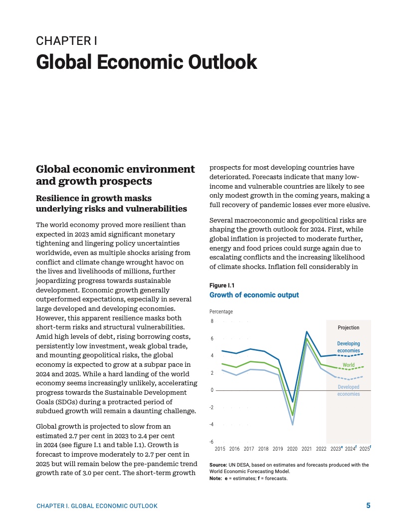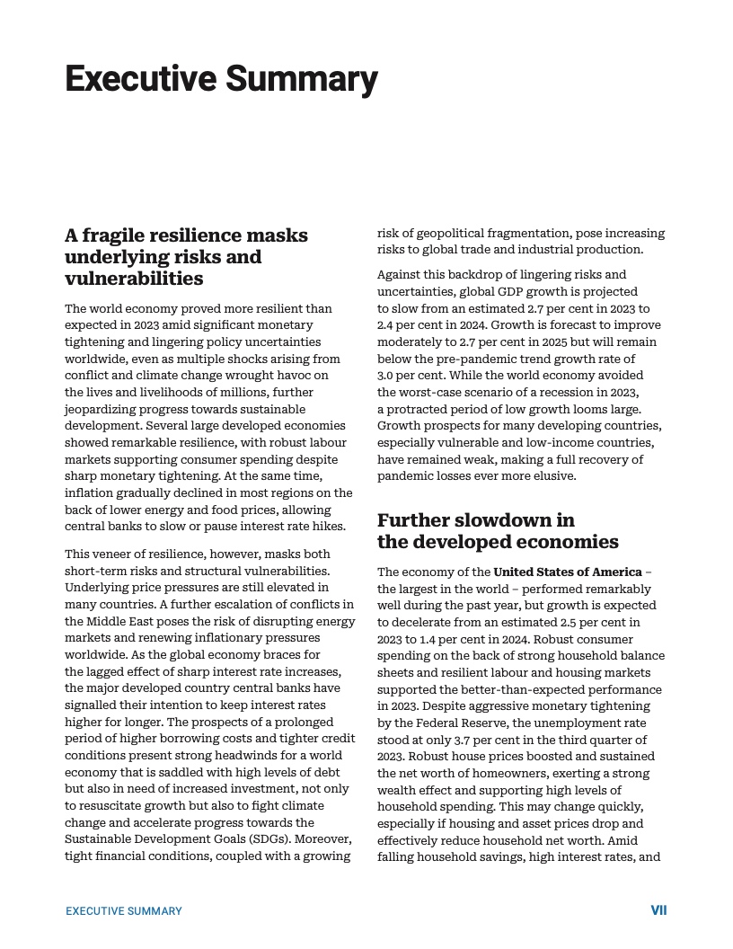 《2024年世界经济形势与展望》报告指出,利率持续高企,冲突进一步升级,国际贸易疲软,气候灾害增多,给全球增长带来巨大挑战。报告预计,全球经济增长将从2023年的2.7%放缓至2024年的2.4%,低于疫情前3%的增长率。