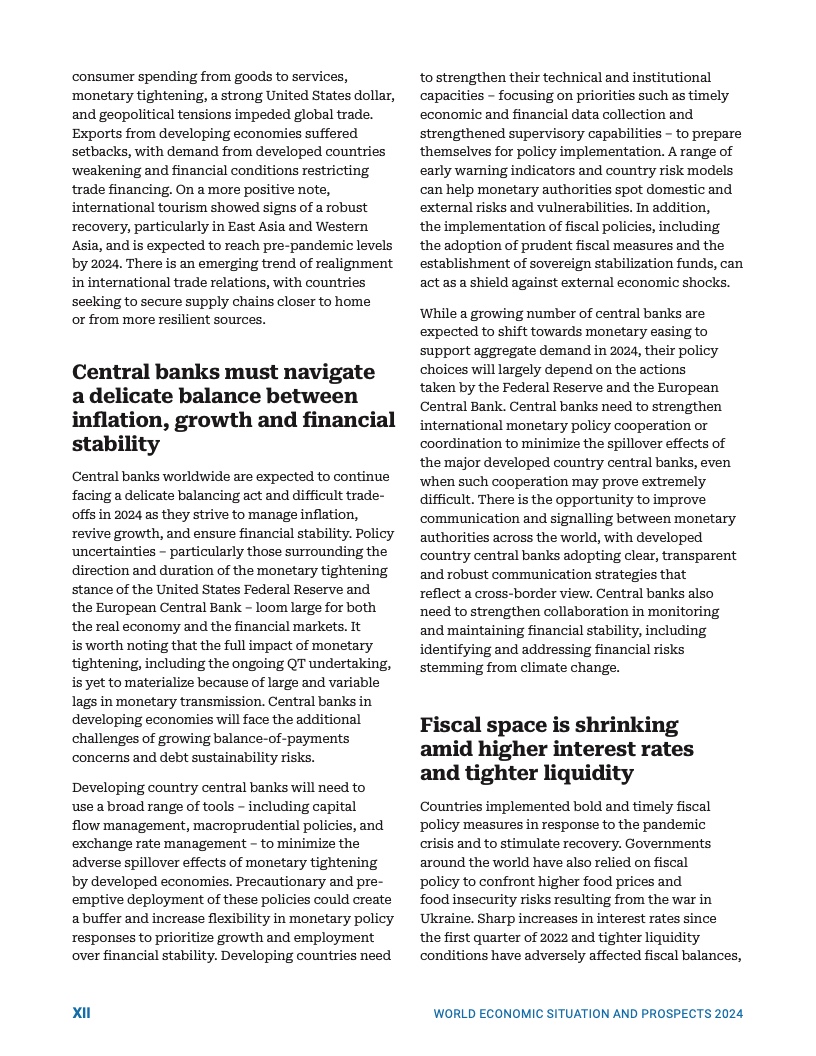 报告认为,世界各地的中央银行在实现通货膨胀、增长和金融稳定目标之间的平衡时,继续面临艰难的权衡。发展中国家的中央银行将尤其需要部署广泛的宏观经济和宏观审慎政策工具,以尽量减少发达经济体货币紧缩的不利溢出效应。