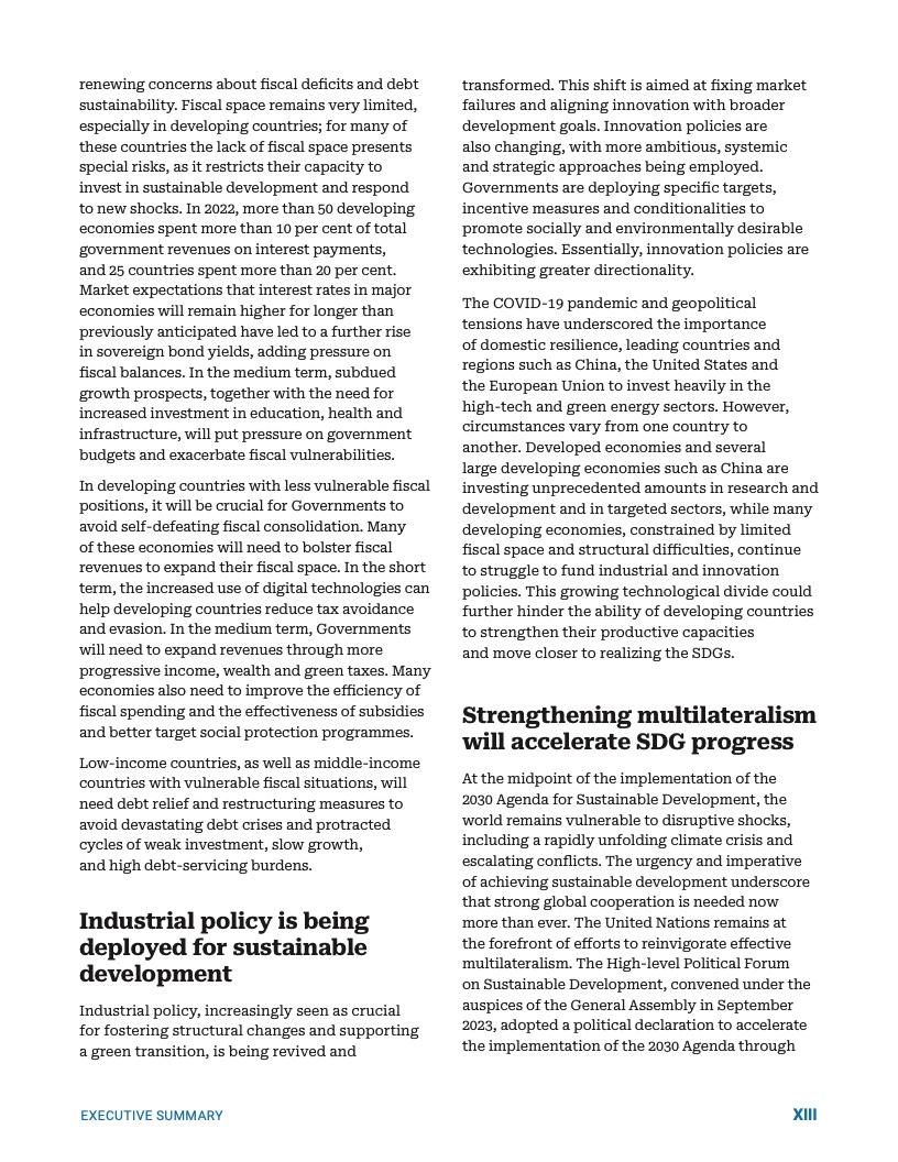 报告还强调,为避免债务危机并向发展中国家提供充足资金,迫切需要采取有力、有效的全球合作举措。财政状况脆弱的低收入国家和中等收入国家需要债务减免和债务重组,以避免投资疲软、增长缓慢和偿债负担沉重的长期循环。
