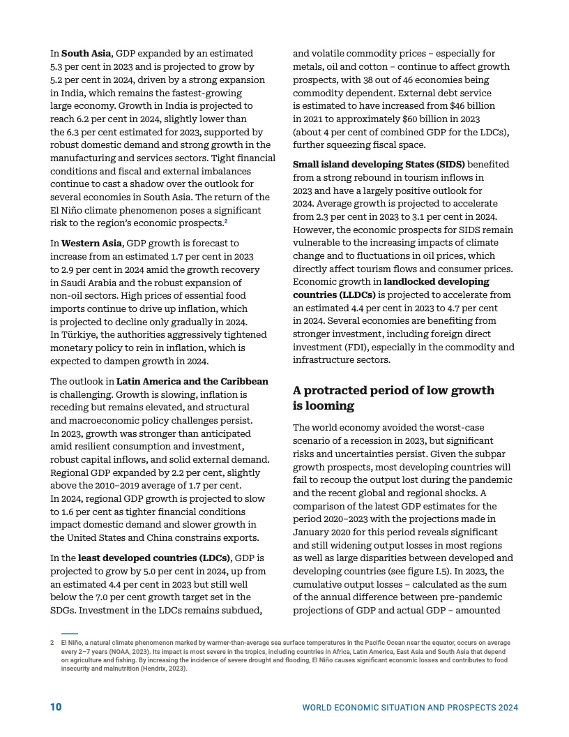 对于低收入的脆弱经济体而言,国际收支平衡压力和债务可持续性风险正不断增大。特别是小岛屿发展中国家,其经济前景将受到沉重债务负担、高利率、日益增长的气候相关脆弱性等制约。这些制约有可能会破坏在可持续发展目标上取得的成果,在某些情况下甚至会让这些成果付之东流。