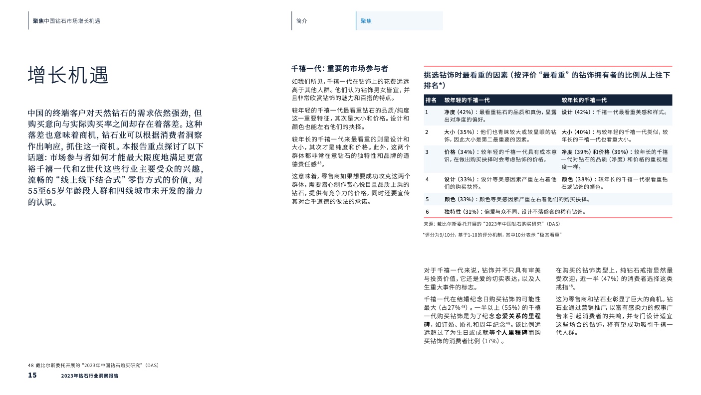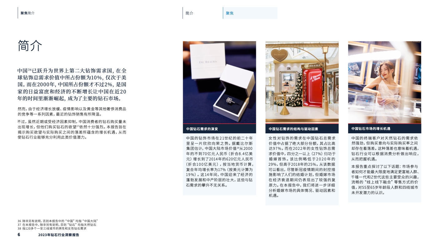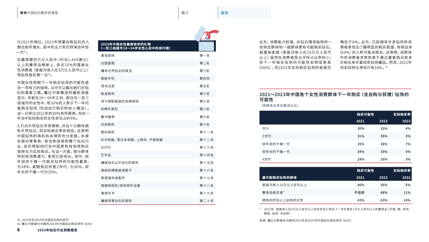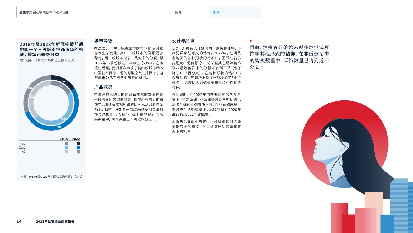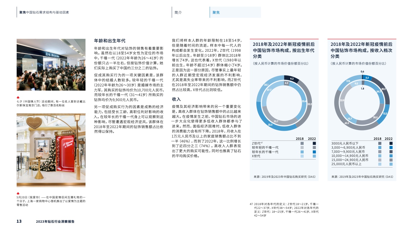 本世纪初的一段时间里,中国的钻饰需求出 现了非常强劲的增长,但是接着发生的新冠 疫情影响了消费者的购买率,而且人口流动 限制 措 施 结 束 后,需 求 的 复 苏速 度也低 于 预期,目前钻石需求正处于艰难时期。但本 报告力求越过眼前的实际挑战,审视钻石在 中国的长期潜力,以及钻石业如何才能最有 效地与中国不同的消费群体建立连接。