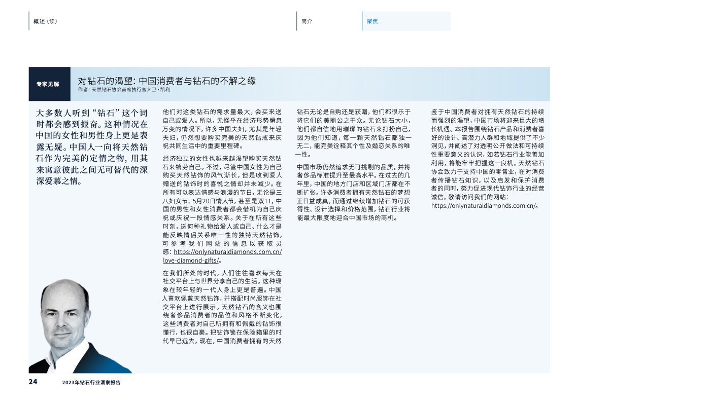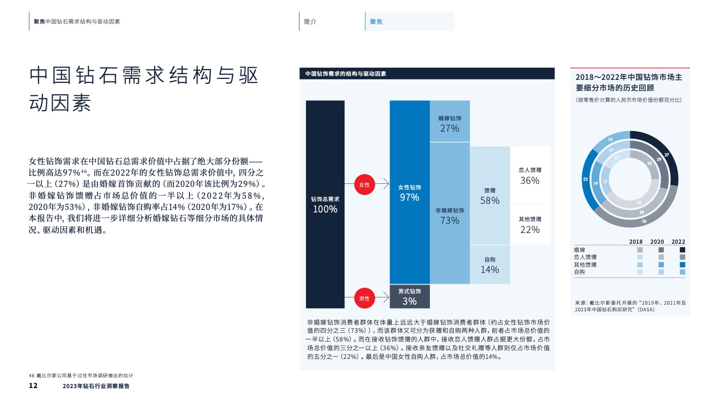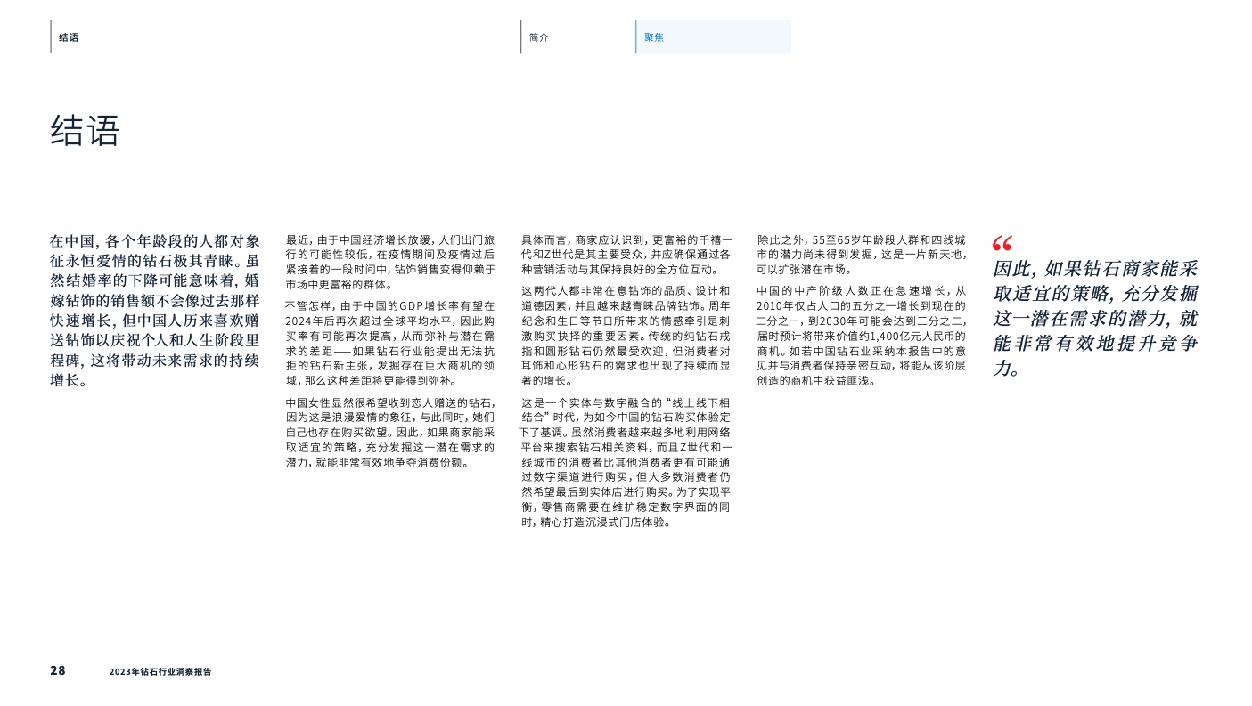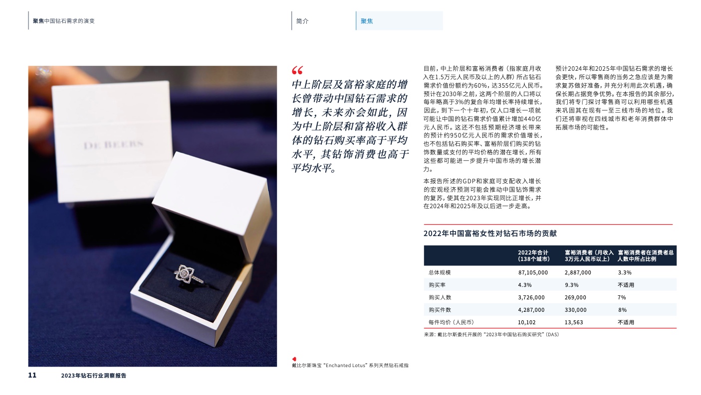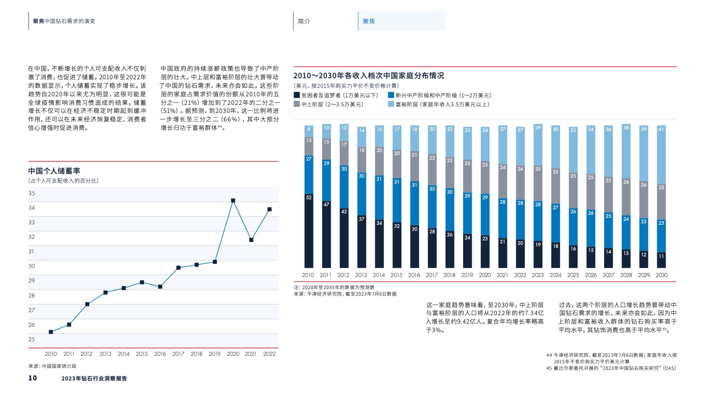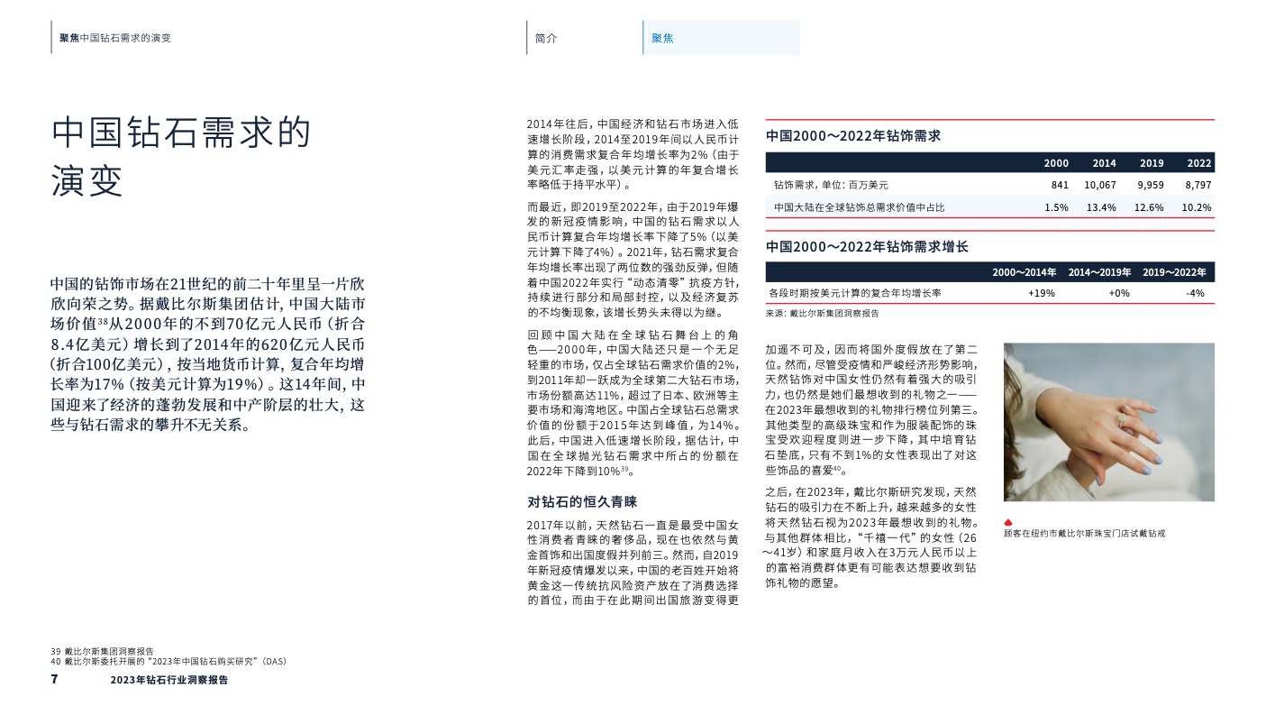 本世纪初的一段时间里,中国的钻饰需求出 现了非常强劲的增长,但是接着发生的新冠 疫情影响了消费者的购买率,而且人口流动 限制 措 施 结 束 后,需 求 的 复 苏速 度也低 于 预期,目前钻石需求正处于艰难时期。但本 报告力求越过眼前的实际挑战,审视钻石在 中国的长期潜力,以及钻石业如何才能最有 效地与中国不同的消费群体建立连接。
