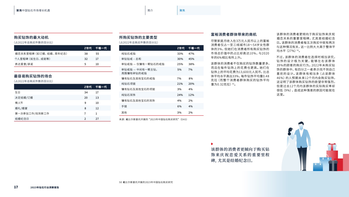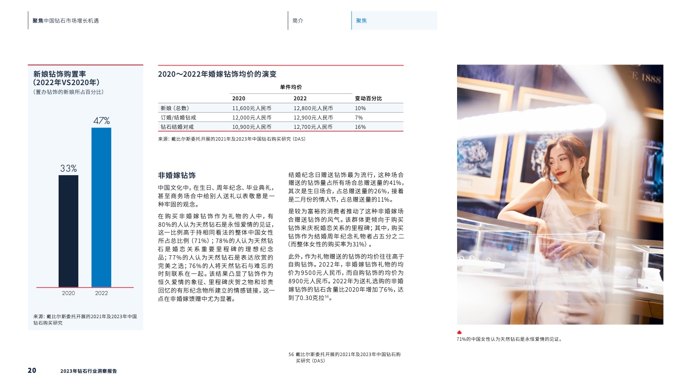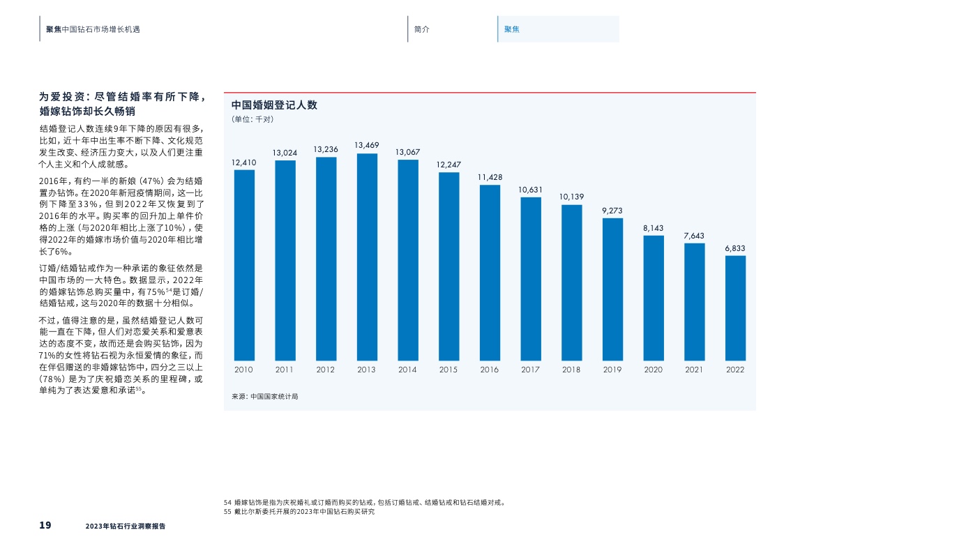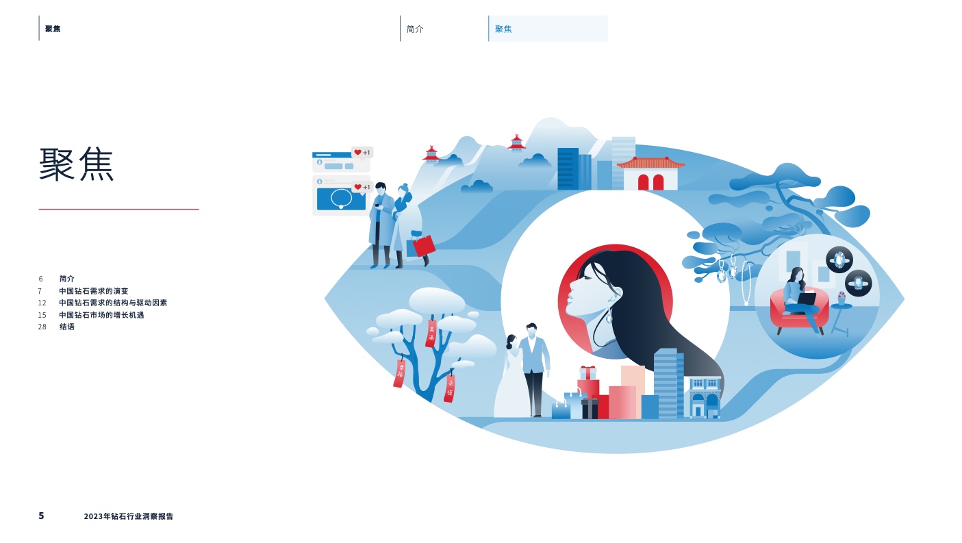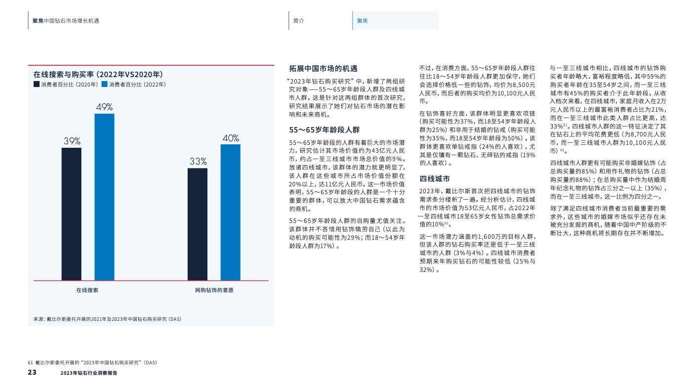 本世纪初的一段时间里,中国的钻饰需求出 现了非常强劲的增长,但是接着发生的新冠 疫情影响了消费者的购买率,而且人口流动 限制 措 施 结 束 后,需 求 的 复 苏速 度也低 于 预期,目前钻石需求正处于艰难时期。但本 报告力求越过眼前的实际挑战,审视钻石在 中国的长期潜力,以及钻石业如何才能最有 效地与中国不同的消费群体建立连接。