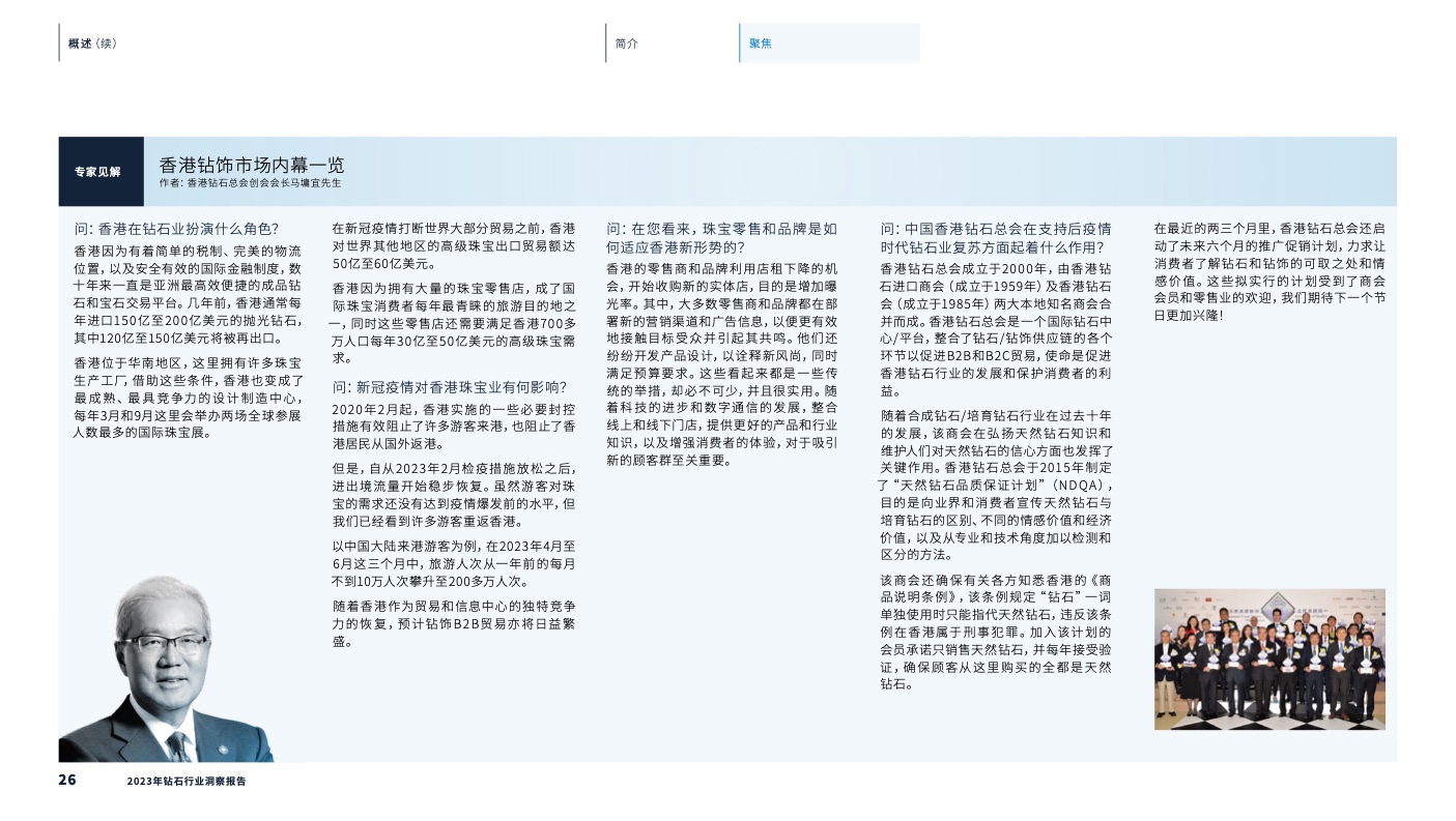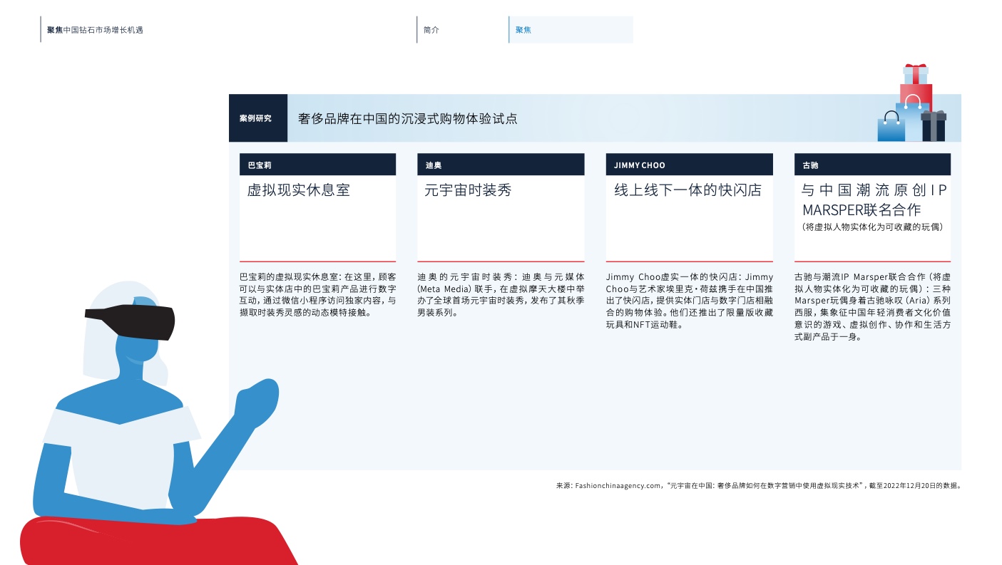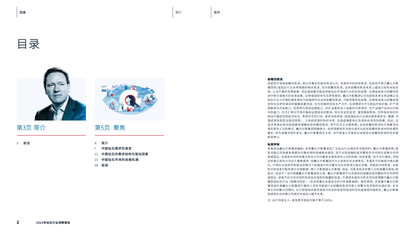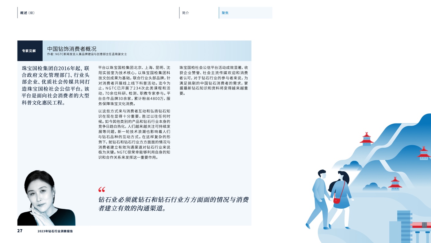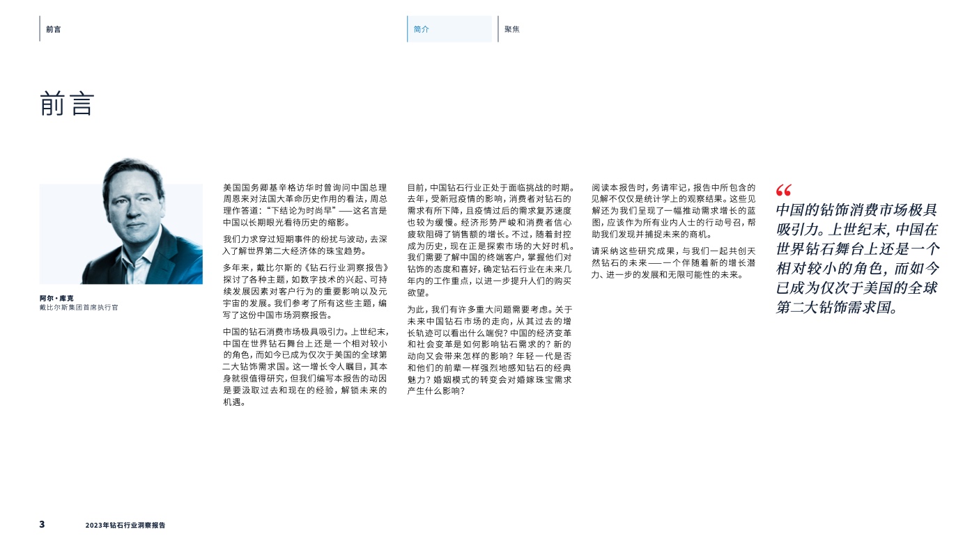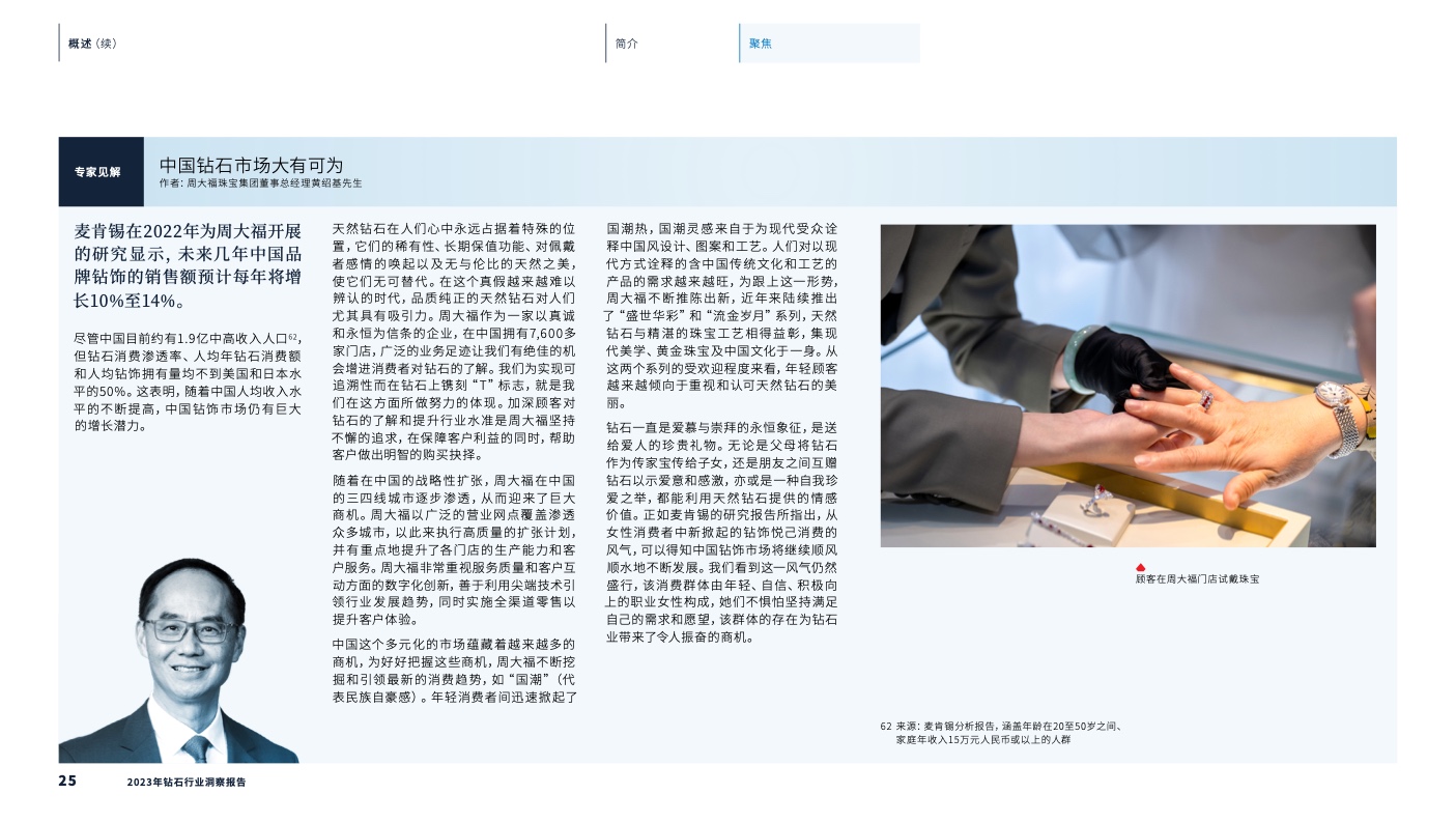 本世纪初的一段时间里,中国的钻饰需求出 现了非常强劲的增长,但是接着发生的新冠 疫情影响了消费者的购买率,而且人口流动 限制 措 施 结 束 后,需 求 的 复 苏速 度也低 于 预期,目前钻石需求正处于艰难时期。但本 报告力求越过眼前的实际挑战,审视钻石在 中国的长期潜力,以及钻石业如何才能最有 效地与中国不同的消费群体建立连接。
