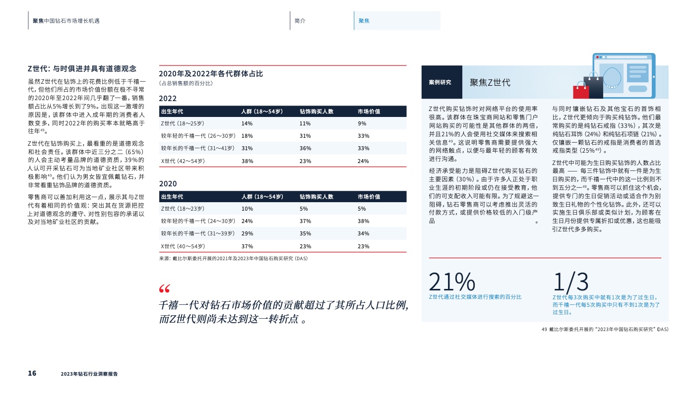千禧一代将钻石视为爱的表达和人生重大 事件的 标 志 。他 们 在 挑 选 钻 石时 特 别 注 重 品质、设计和大小,纯钻戒指是他们的最爱。 Z世代则最看重品牌是否遵守道德观念以及 是否有社会责任感。虽然Z世代在钻饰市场 的体量在不断扩大,但其购买能力仍然是一 个消费阻碍。零售商可以通过提供灵活的付 款方式或价格较低的入门级产品来吸引该 群体。