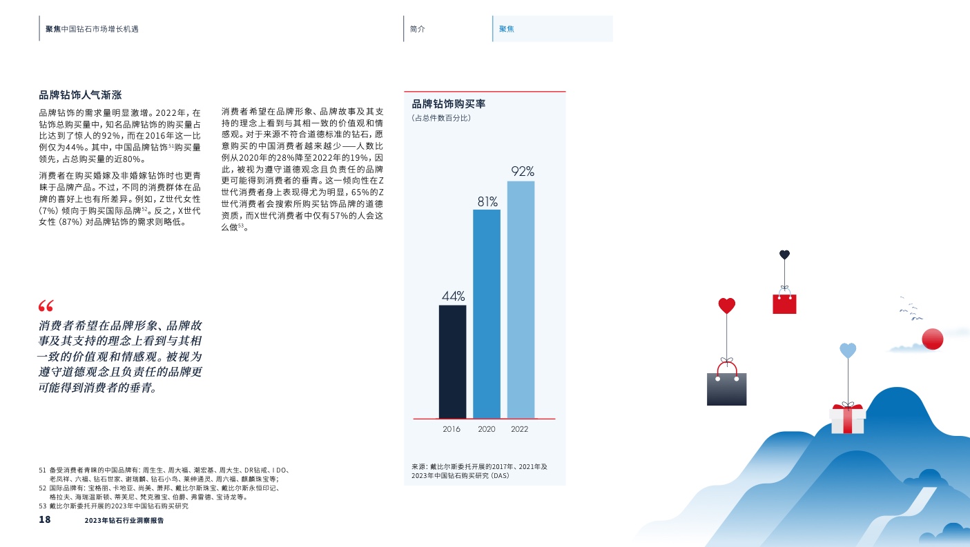 尽管钻石耳饰等产品的销售额在总需求价 值中所占份额在不断增加,但纯钻石戒指仍 然比 其他 类 型的 钻饰更 受 欢 迎 。与此情 形 类似,在人们购买的各种形状的钻石中,圆 形钻石的占比仍然最大,但心形钻石也开始 逐渐流行。(婚嫁和非婚嫁钻饰消费者群体)对品牌钻 饰的需求明显激增。2022年购买的10件钻 饰中有9 件 是 品 牌 钻饰,其中近 8件 来自中 国品牌。