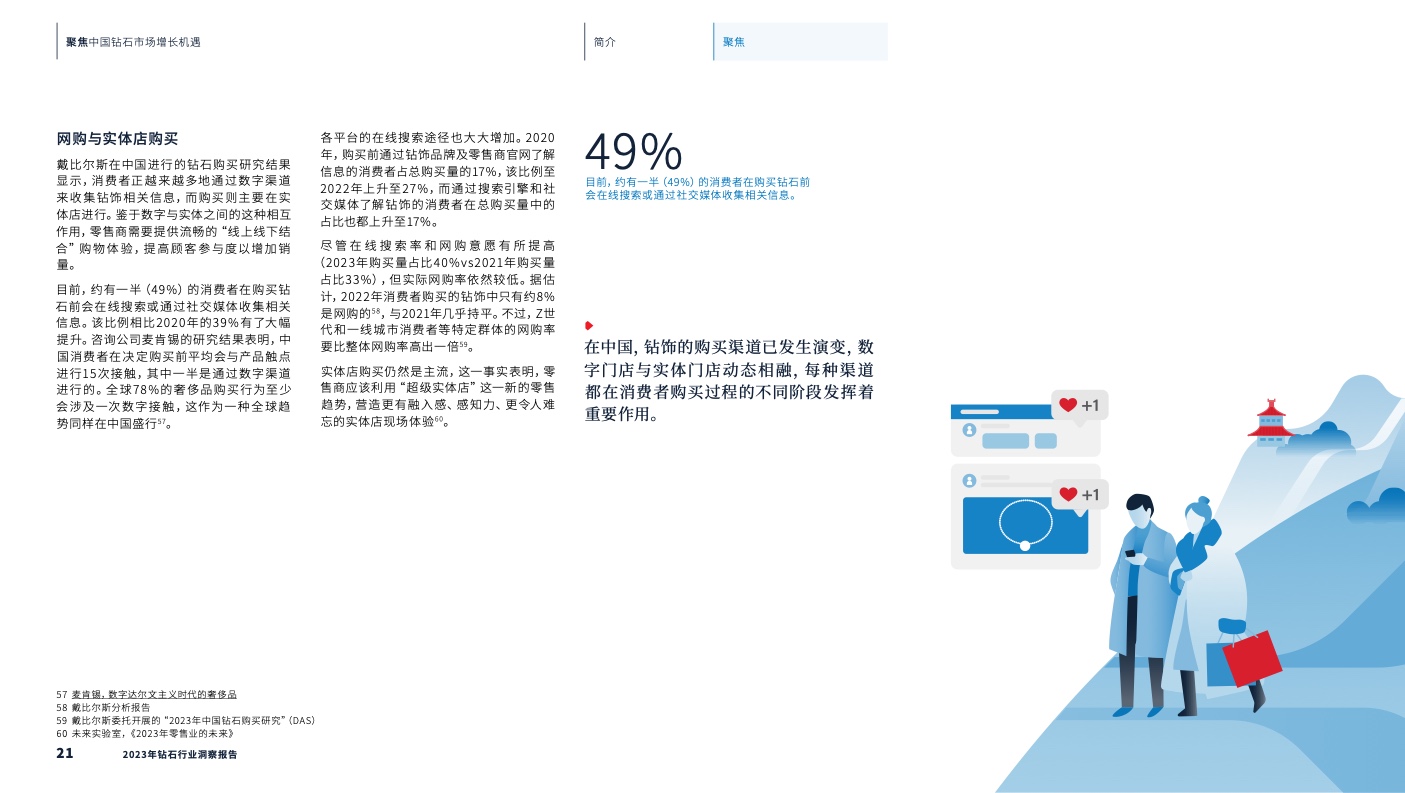 约有一半的消费者在购买钻石前会在线搜 索或通过社交媒体收集信息。虽然Z世代和 一线城市消费者比其他消费者更倾向于网 购,但钻 饰 的 购买 主 要 还 是 在 实体 店 进 行 的。这就凸显了打造令人难忘的店内体验的 重要性。