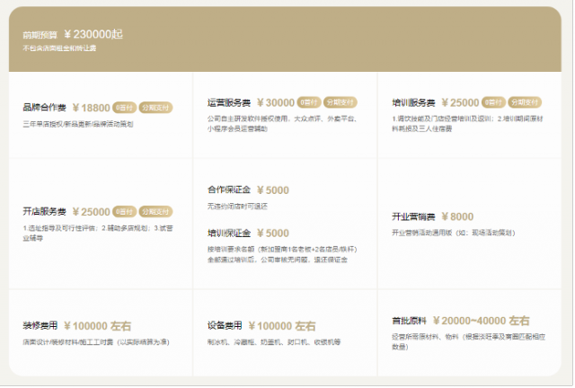 根据官网,古茗的加盟费用为9.88万元,可以分期支付,除此之外再加上保证金、开业营销费、装修、设备、原料等费用还需要准备5.8万元。如果加上运营成本,古茗给出的新店最低启动资金是23万元,这还不包括店面租金和转让费。