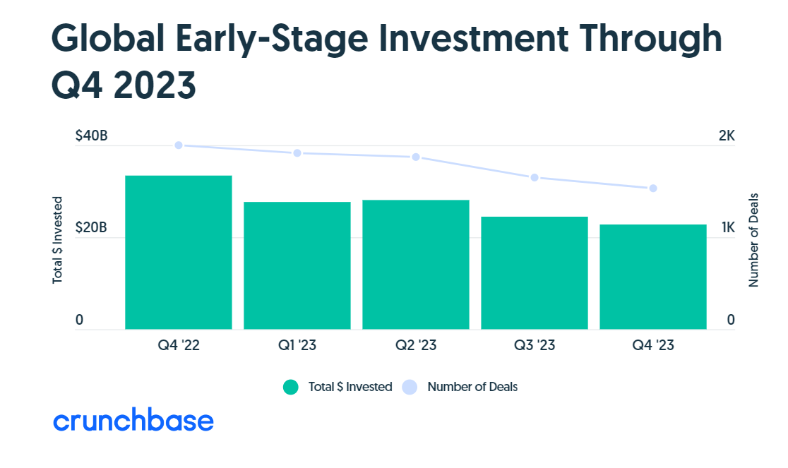 与其他投资阶段相比,早期投资在2023年下降幅度最大。