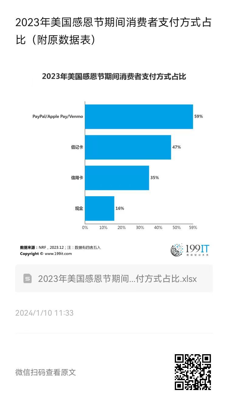 2023年美国感恩节期间消费者支付方式占比(附原数据表) 更多阅读:2023年美国感恩节期间消费者礼物灵感来源(附原数据表) Adobe:2016年感恩节美国电商销售额首次突破20亿美元YouGov:15%的美国人仍在偿还2017年假日购物的债务YouGov:70%的美国成年人庆祝2021年感恩节2012年感恩节PayPal移动支付销售额增长173%NRF:2019年感恩节到网络星期一购物者平均支出361.90美元YouGov:调查显示约90%的美国人吃火鸡庆祝感恩节YouGov:超过一半美国人在感恩节周末购买礼物Adobe:2019年美国感恩节在线销售额达42亿美元Morning Consult:2018年美国零售业调查报告A4A:2018年美国航空业报告YouGov:美国人更愿意在感恩节给员工放假的商店购买商品美国全国零售商联合会:2012年美国实体商店和网络销售总额达到591亿美元 人均消费423美元Monetate:2017年黑色星期五美国消费者平均花费142.86美元comScore:网络星期一美国PC端在线支出33.6亿美元