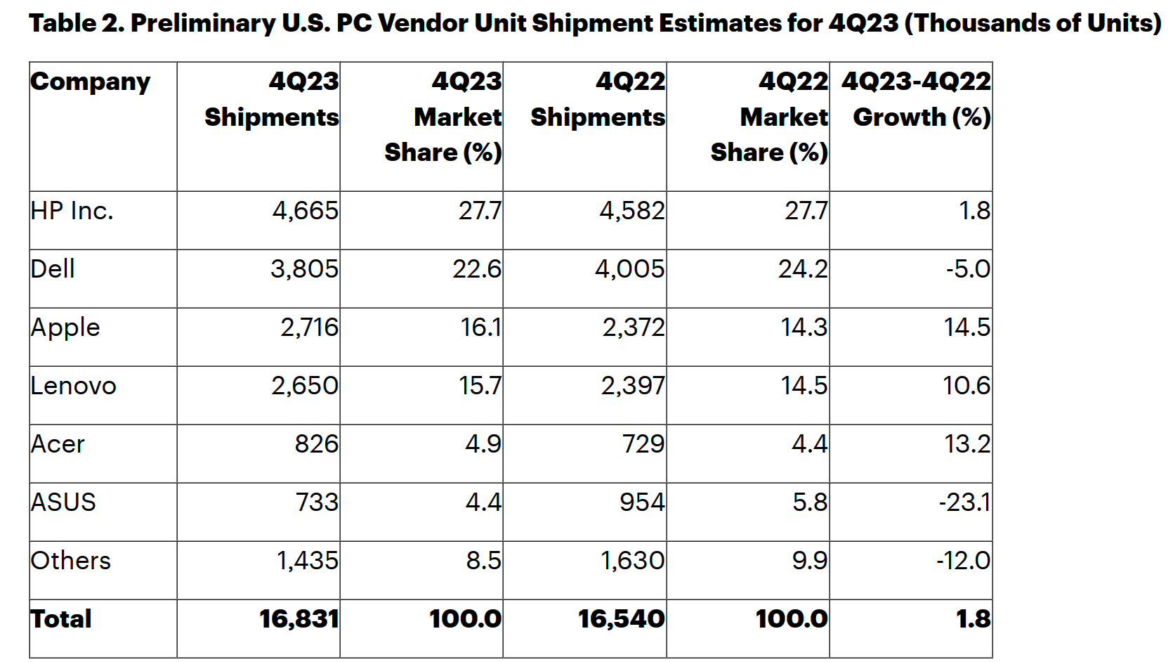 从地区市场来看,Gartner 写道,美国 PC 市场自 2021 年第二季度以来首次在第四季度录得同比增长,2023 年第四季度增长 1.8%–台式机的下降抵消了笔记本电脑的增长。惠普继续保持美国市场第一的位置,戴尔和苹果紧随其后。