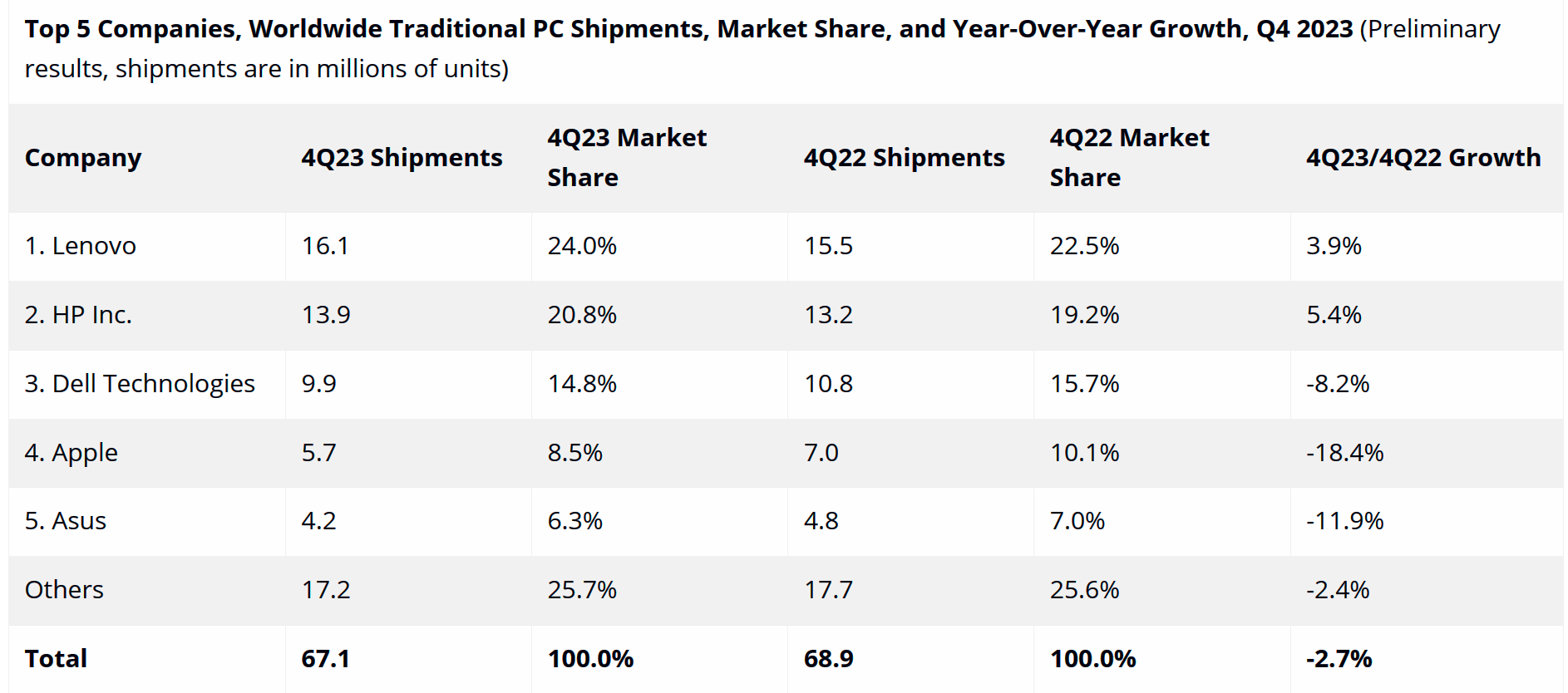 另一家大型分析公司 IDC 的数据显示,去年全球 PC 出货量下降了 13.9%。这与 Gartner 的估计相似,但 IDC 认为 2023 年第四季度的出货量下降了 2.7%。