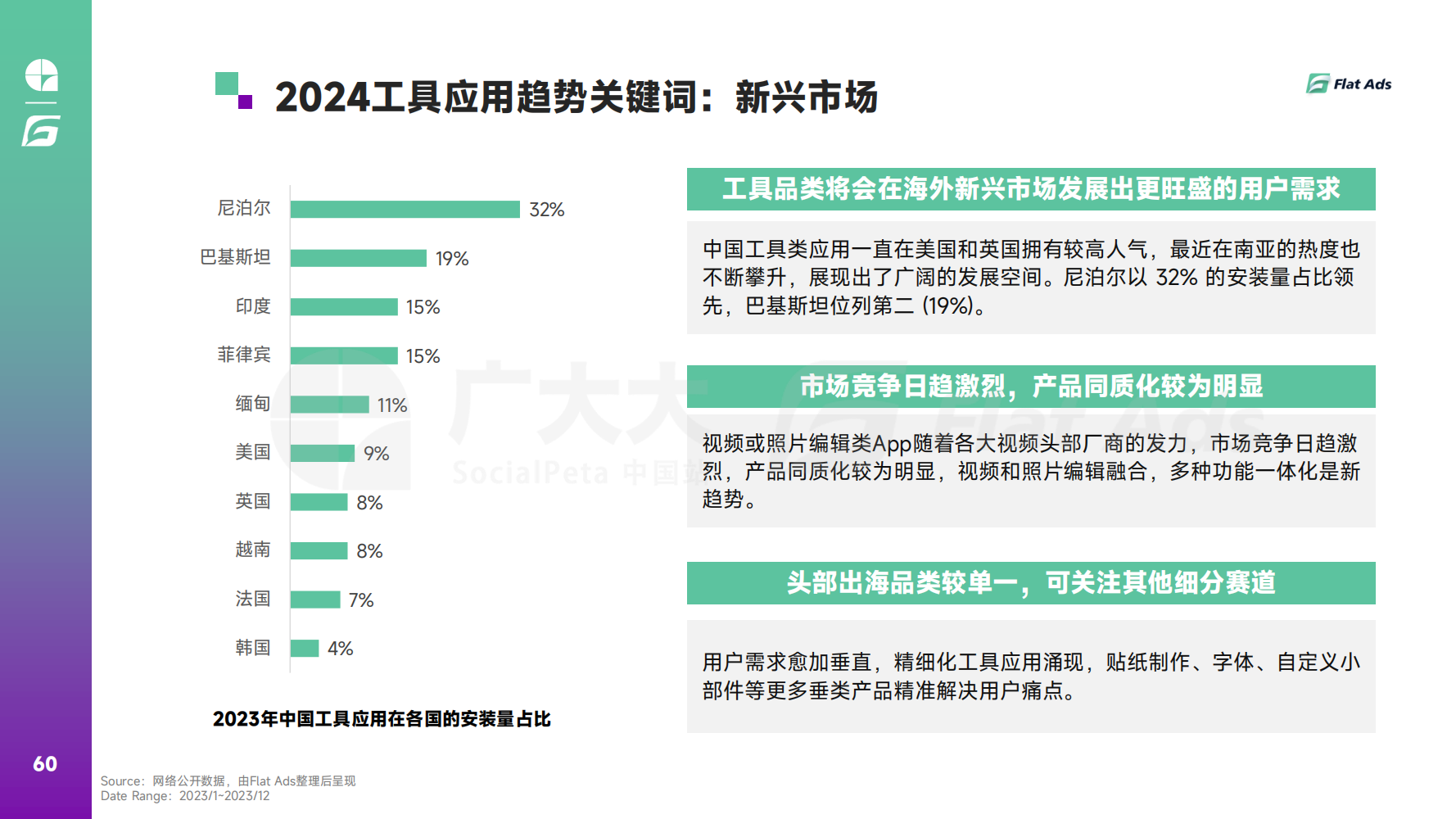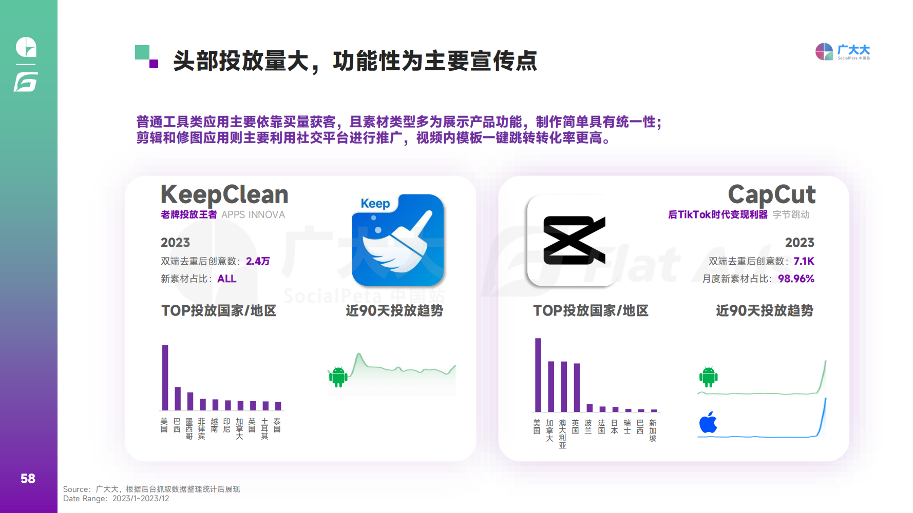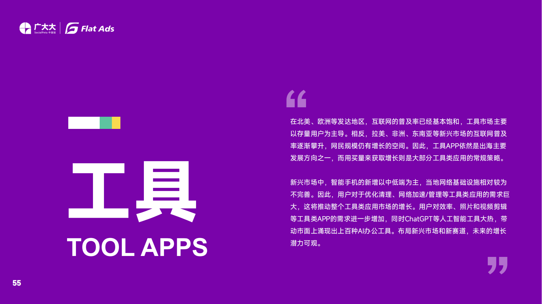 然而,在千变万化的市场环境中,仅有赛道热度远远不够,出海公司需要深入了解目标用户的需求,制定有效的营销策略,才能实现业务的增长和成功。为此,广大大联合Flat Ads发布了《2023年全球移动应用(非游戏)营销趋势白皮书》,希望能帮助更多出海人了解那些正在快速发展的领域,并在市场竞争中取得成功。