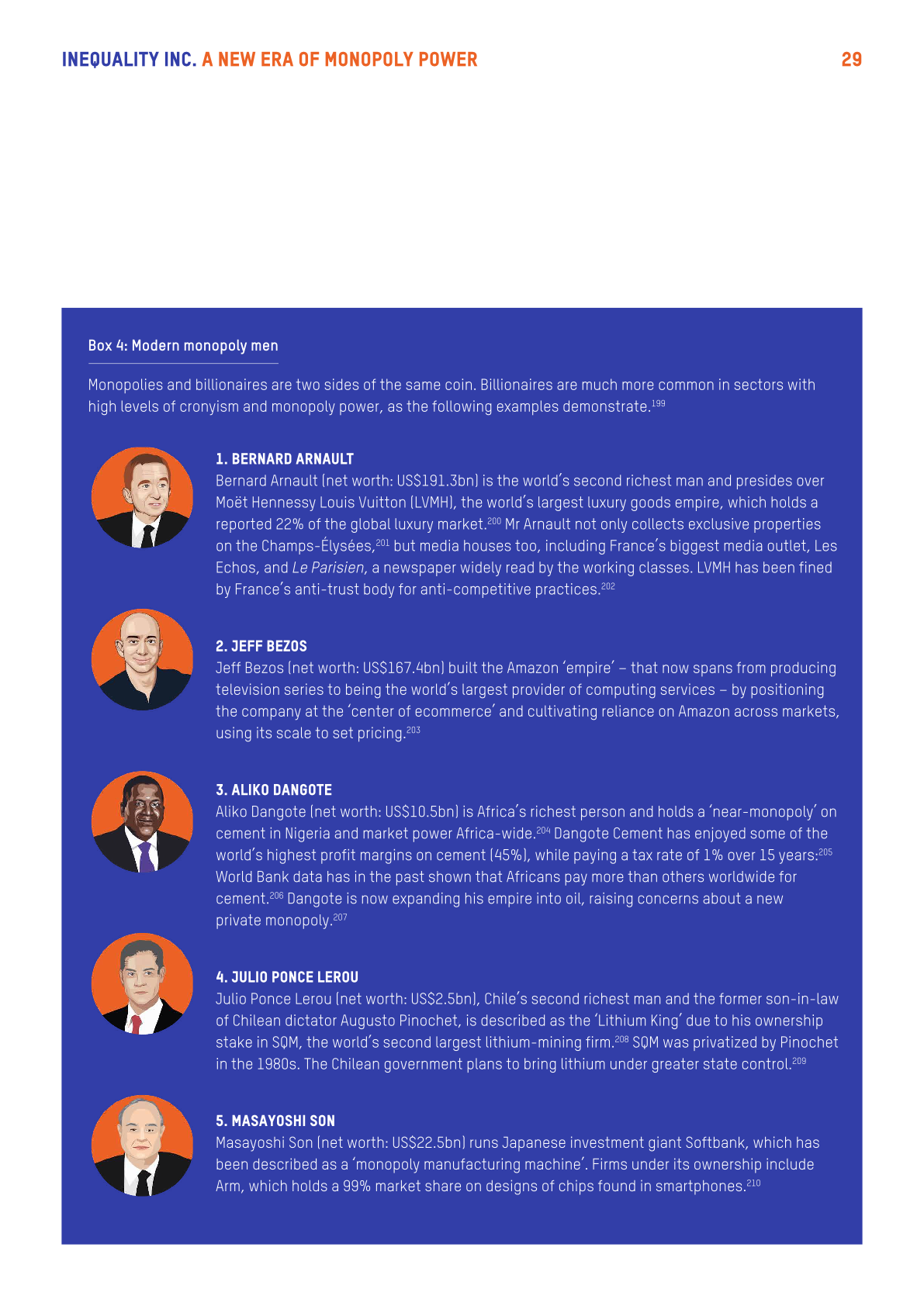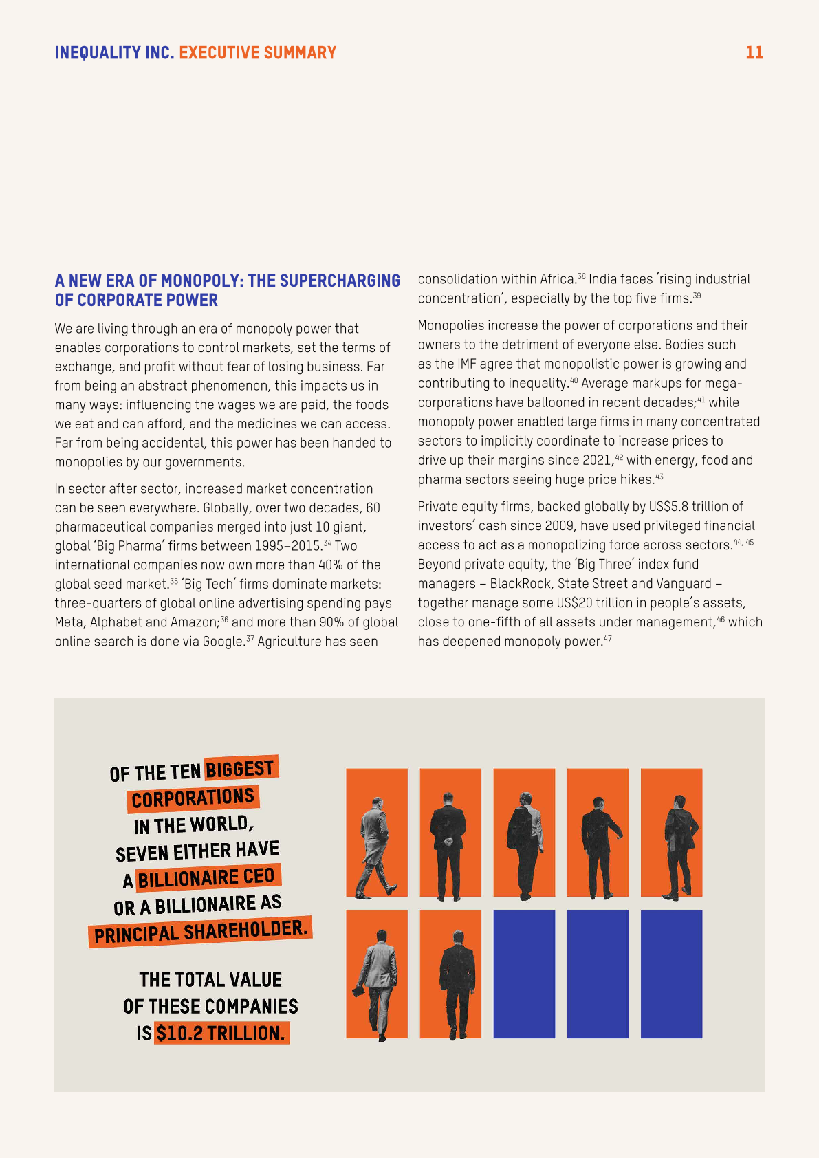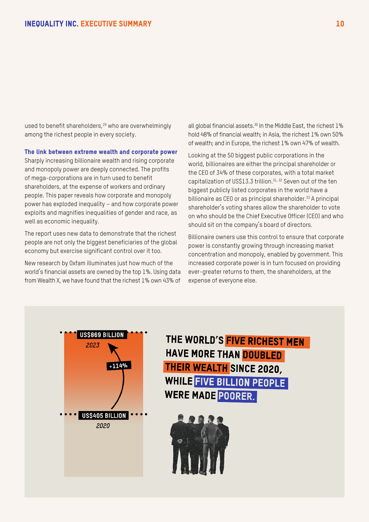 报告指出,全球十大企业中,当中有七间企业的行政总裁或主要股东均由亿万富豪担任,需这些企业的总市值高达10.2万亿美元,相当于非洲及拉丁美洲所有国家的国内生产总值总和。