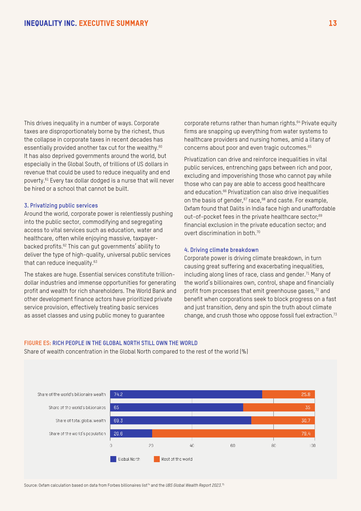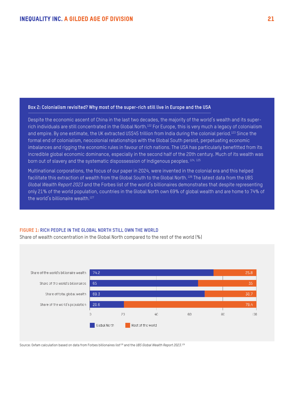 虽然北方富有国家的人口只占全球总人口的21%,但他们却拥有了全球69%的财富;74%亿万富豪来自北方富有国家。