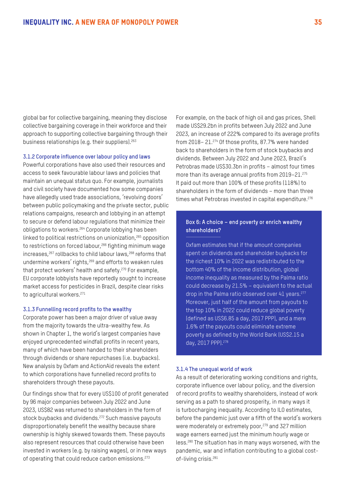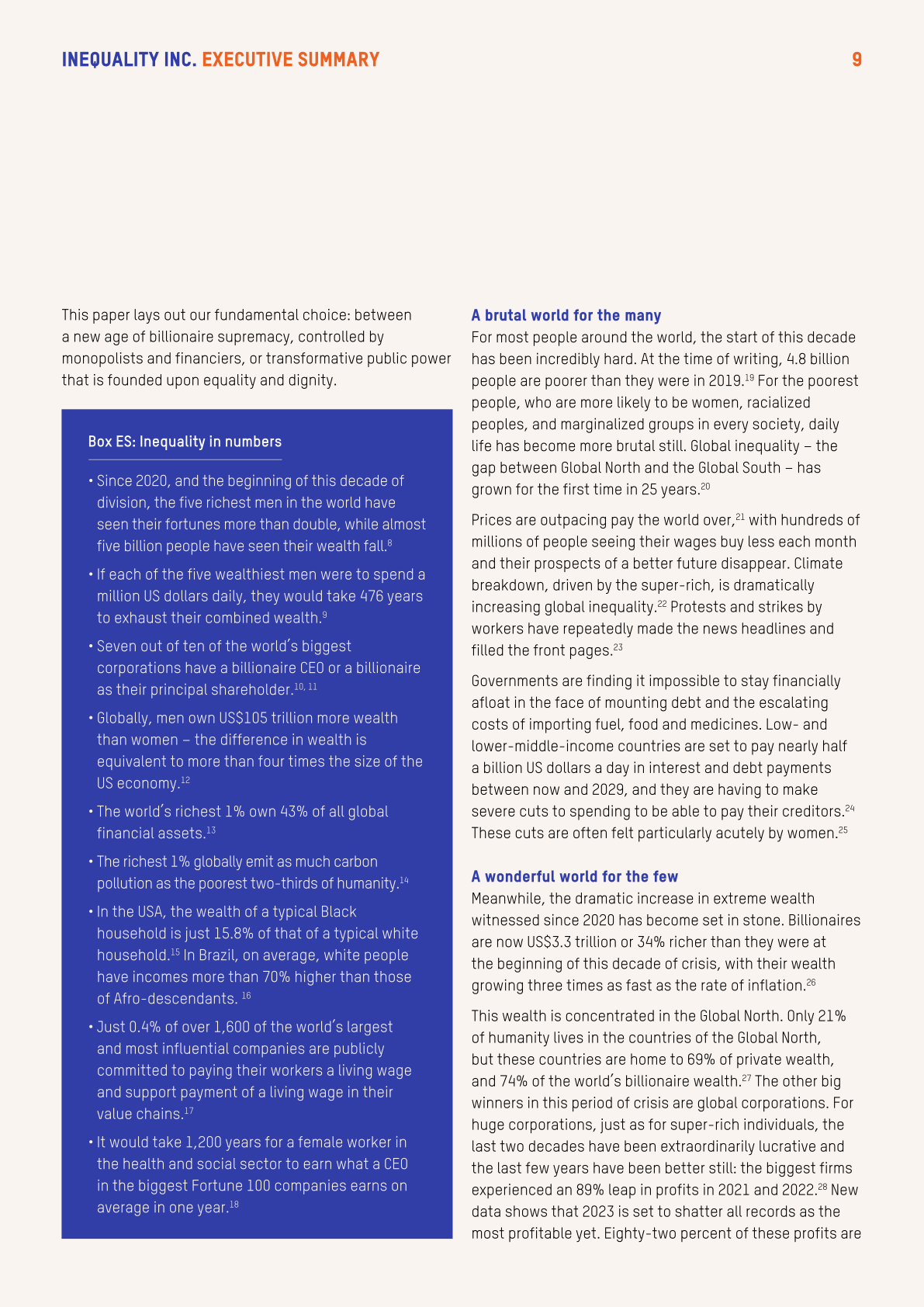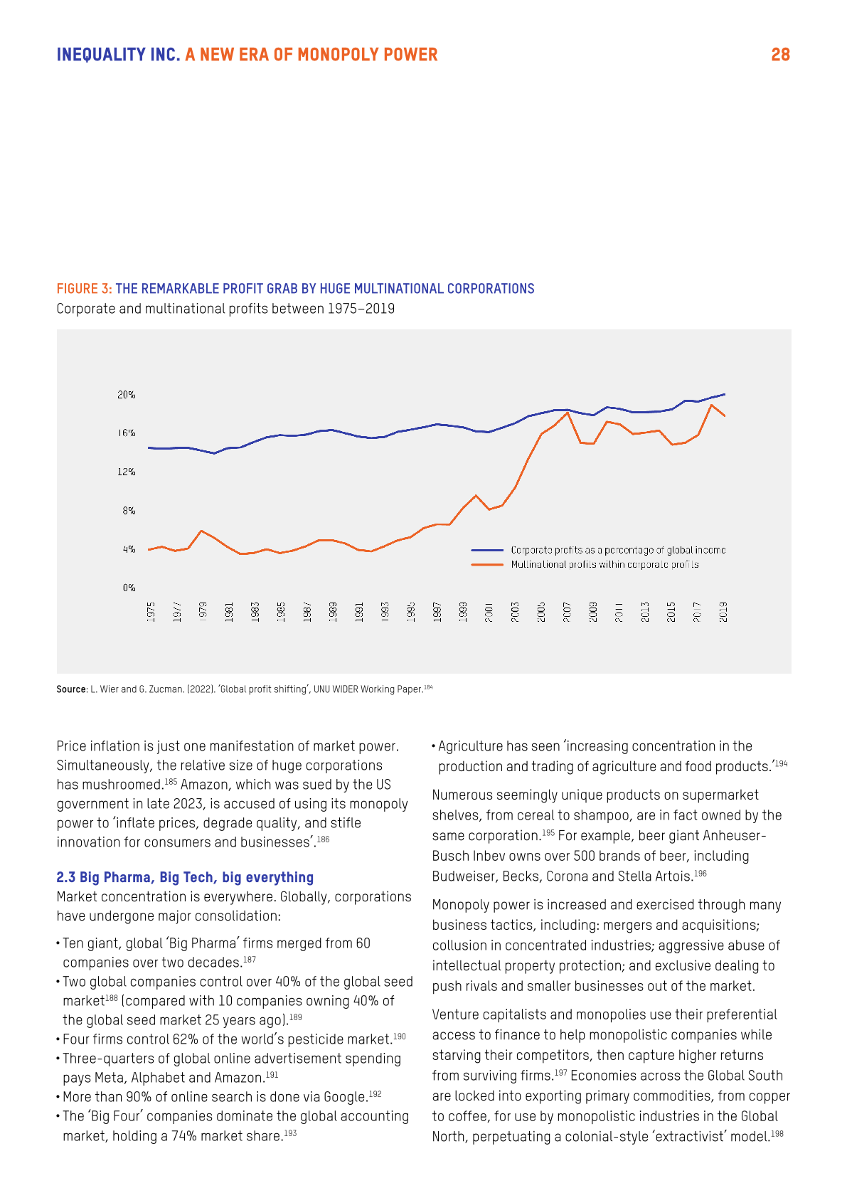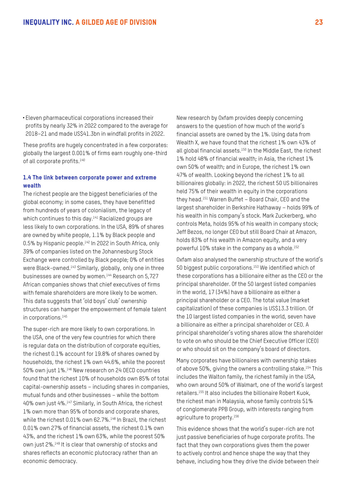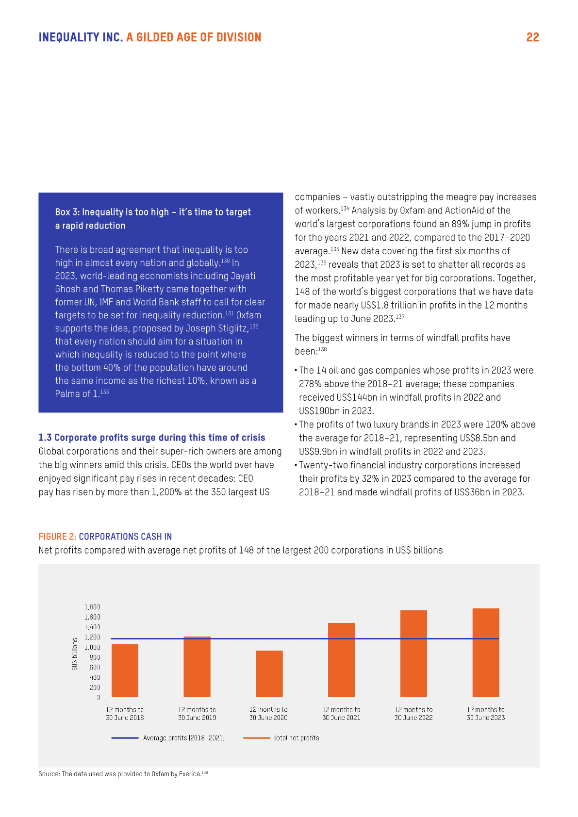 报告亦发现,大企业的利润与超级富豪的财富增长趋势亦成正比。大企业在2023年更创下年度利润新高。报告分析了由2022年7月至2023年6月期间全球大企业的利润,发现148间全球最大企业合共获利1.8万亿美元,与2018年至2021年平均利润相比,增长了52%,当中暴利润更激增近7,000亿美元。另外,报告发现,有96间大企业在此期间获利每100美元,会将当中的82美元分派予富有股东。