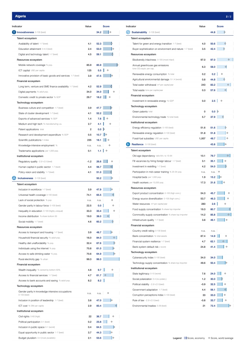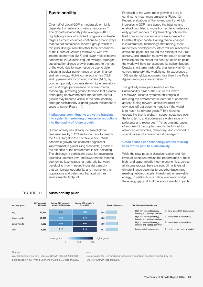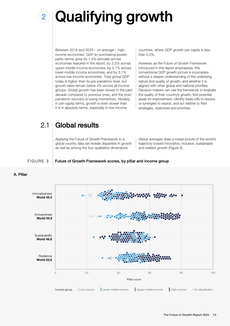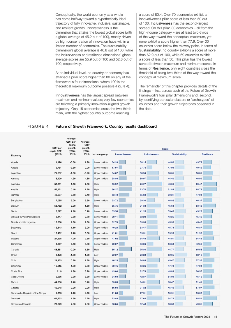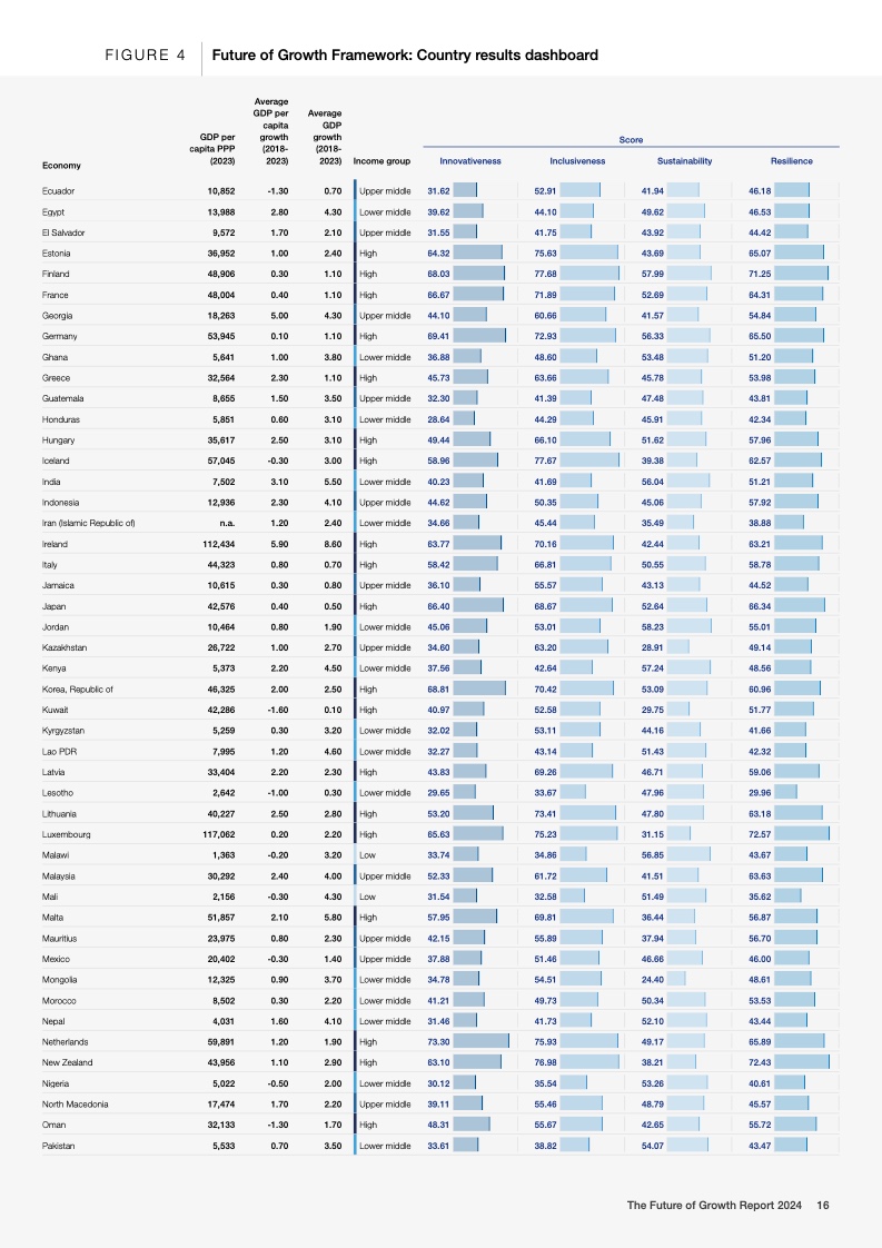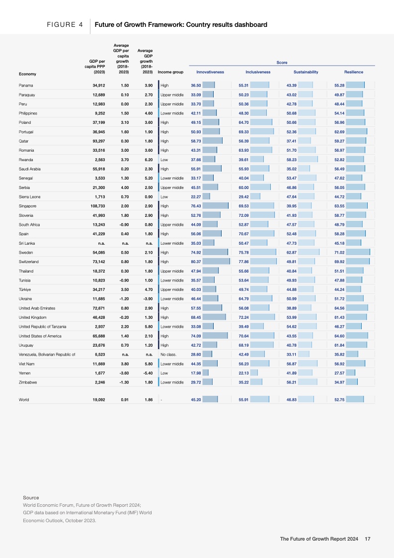 从国家层面来看,在参与评估的107个经济体中,没有一个经济体在框架四大维度的任何一项维度上得分超过80。报告提供了每个国家的分析数据,帮助决策者评估国家增长的特点和性质,确定需要改善提高和协同增效的领域。