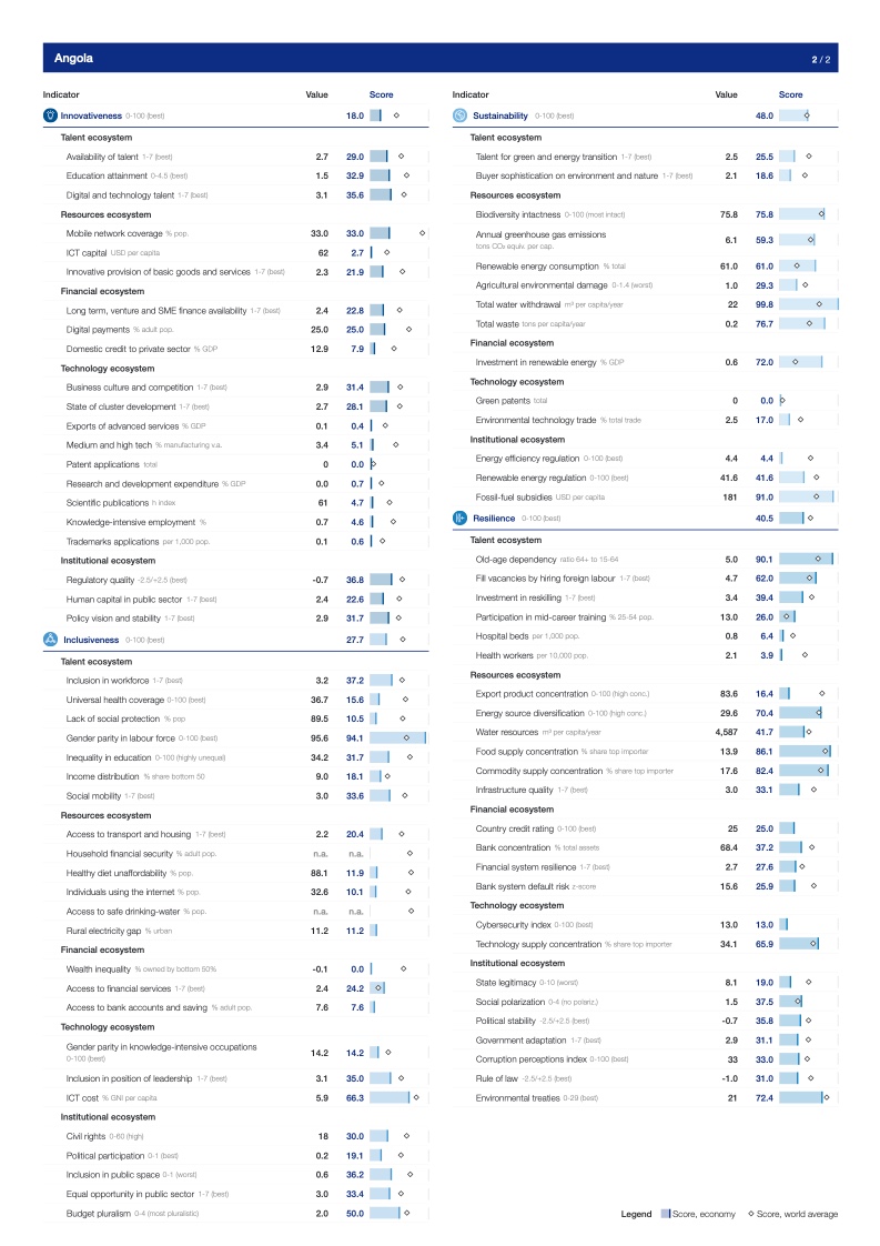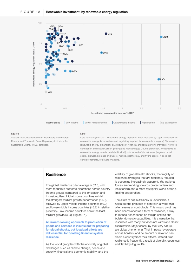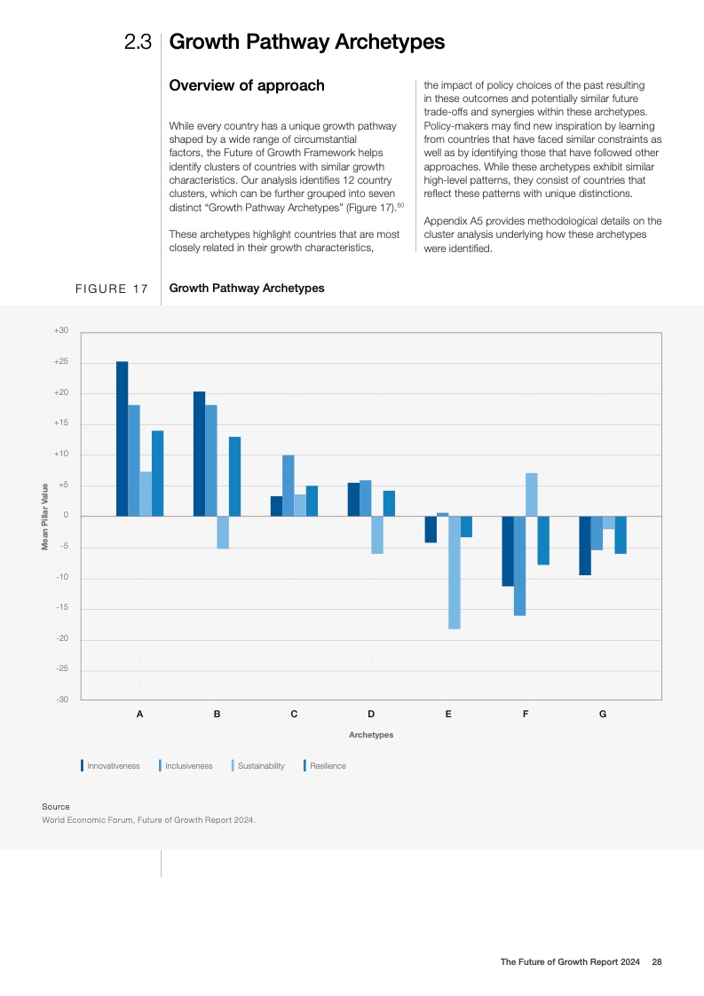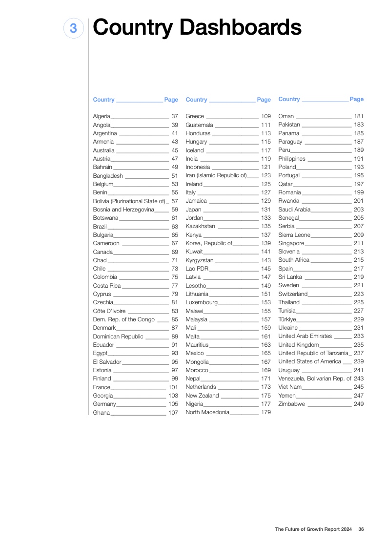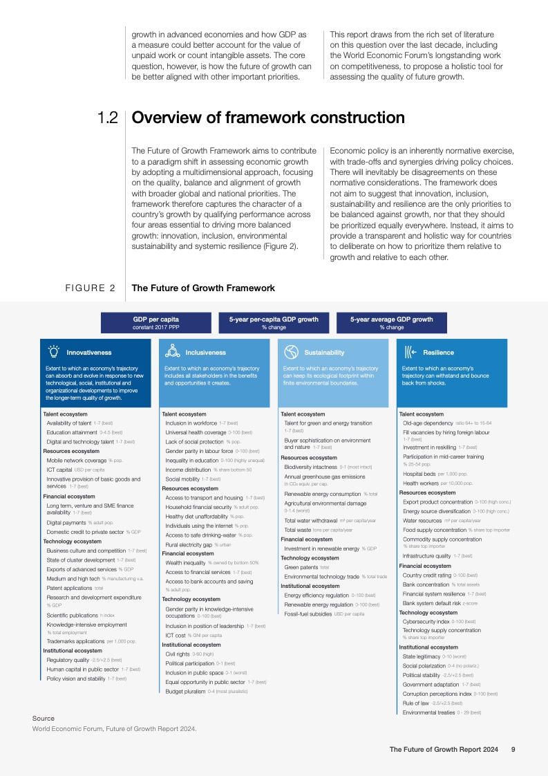 从国家层面来看,在参与评估的107个经济体中,没有一个经济体在框架四大维度的任何一项维度上得分超过80。报告提供了每个国家的分析数据,帮助决策者评估国家增长的特点和性质,确定需要改善提高和协同增效的领域。