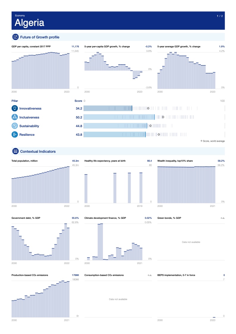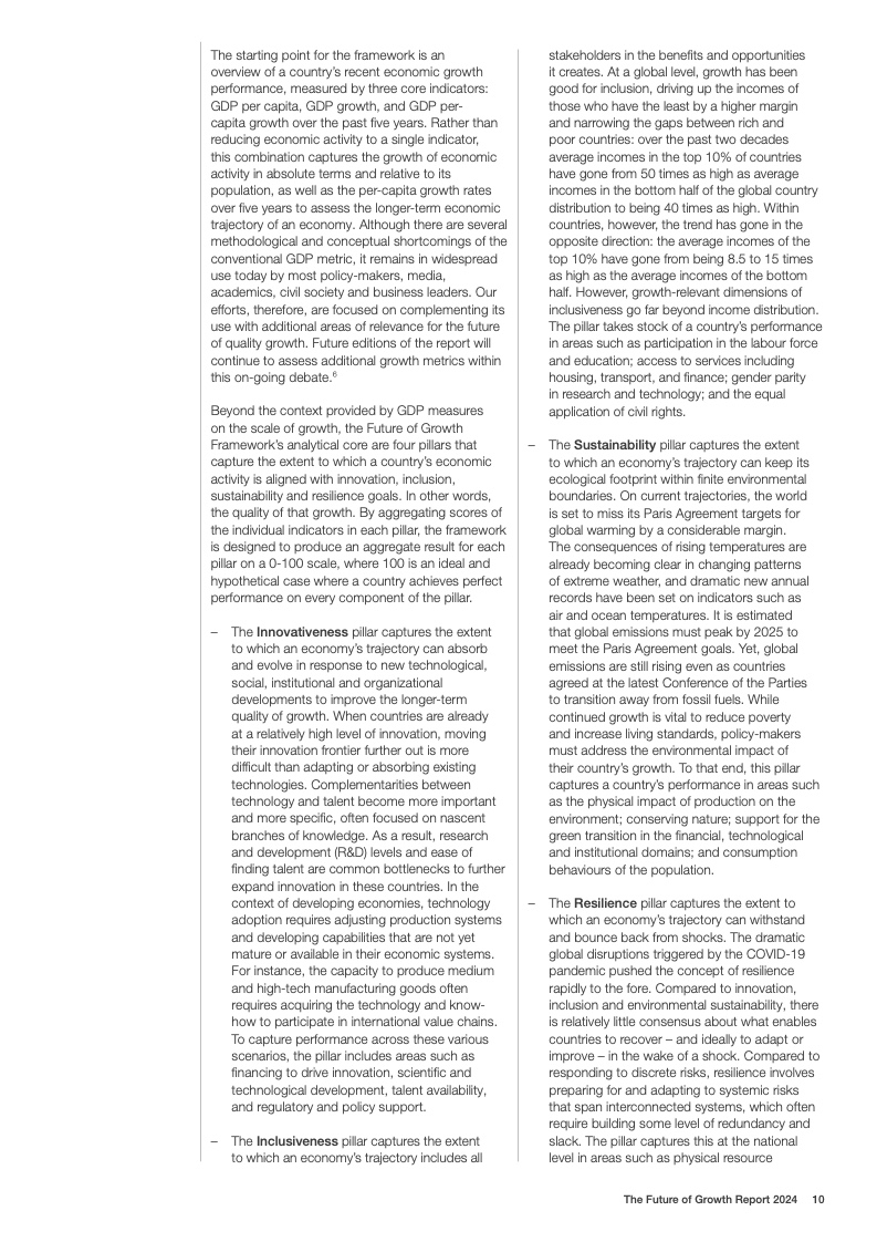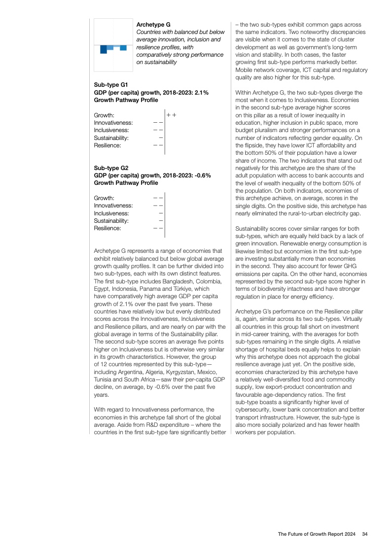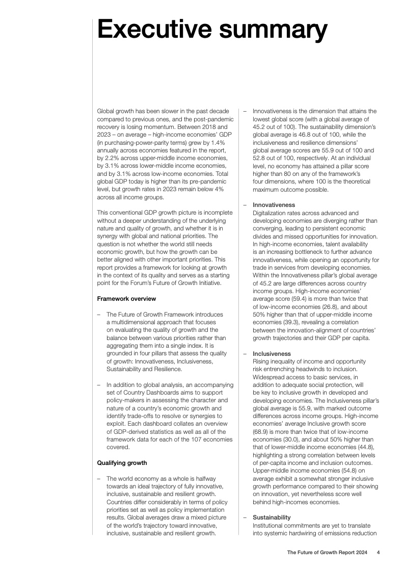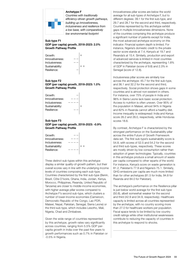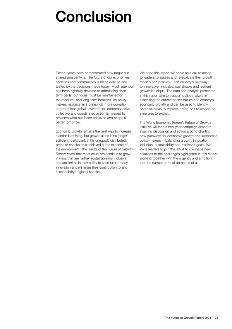 从国家层面来看,在参与评估的107个经济体中,没有一个经济体在框架四大维度的任何一项维度上得分超过80。报告提供了每个国家的分析数据,帮助决策者评估国家增长的特点和性质,确定需要改善提高和协同增效的领域。