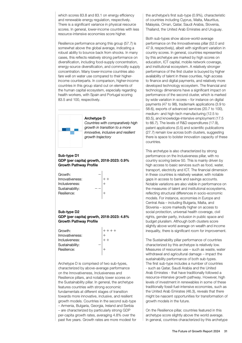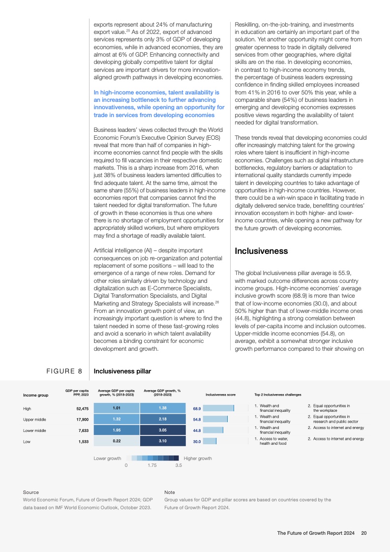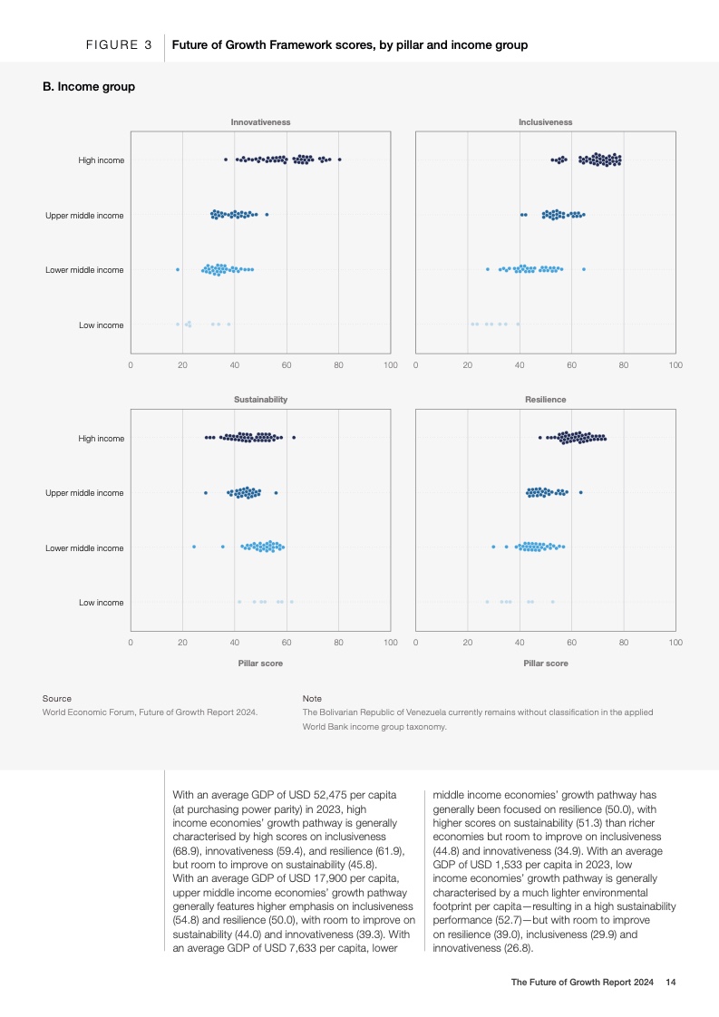 平均来看,高收入经济体人均国内生产总值在2023年达到了52,475美元(按照购买力评价计算),2018-2023这五年的年均增速为1.01%。这些经济体的增长路径在包容性、创新性和韧性等维度的得分较高,分别达到68.9分、59.4分和61.9分,但在可持续性(45.8分)方面尚有改善空间。