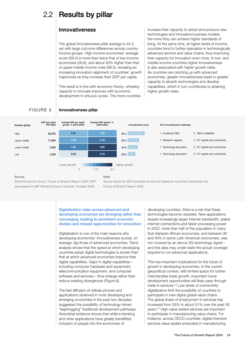 可持续性维度的全球均分为46.8分(满分100分),它体现了经济体在有限的环境边界内维持生态足迹的程度。创新性维度的全球均分最低,仅为45.2分(满分100分),它评估经济体在多大程度上利用新的技术、社会、制度和组织动态并作出相应改变,进而提高长期增长质量。