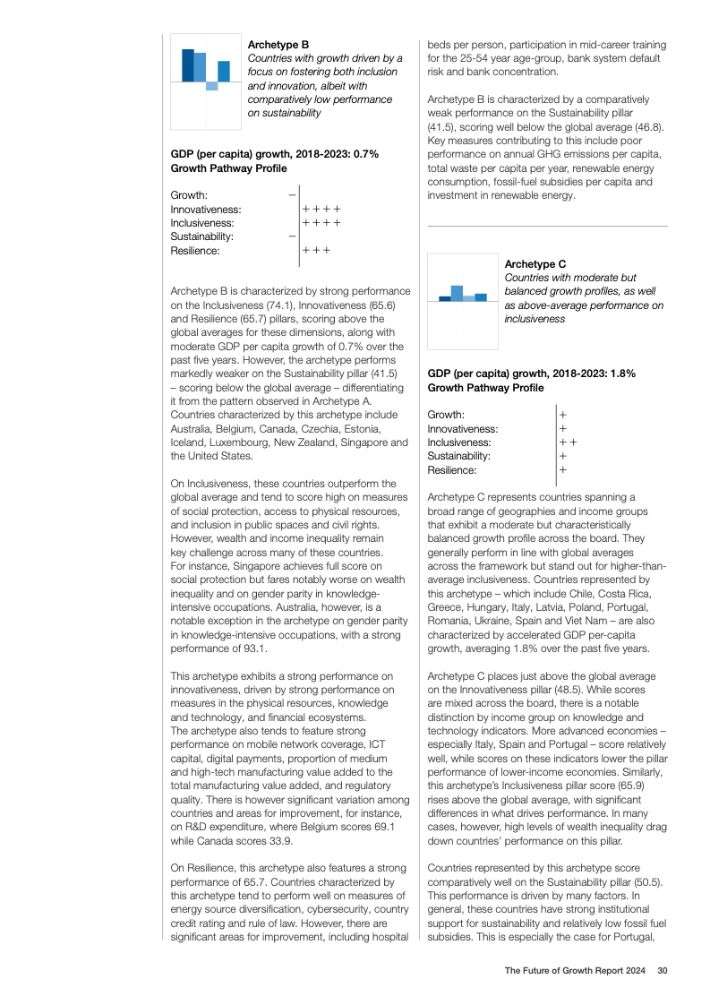 这类国家包括澳大利亚、加拿大、法国、德国、意大利、日本、沙特阿拉伯、韩国、英国和美国。其中,创新性维度的高分国家包括瑞士(80.4分)、新加坡(76.4分)和美国(74.1分);包容性维度的高分国家包括芬兰(77.7分)和加拿大(75.8分);可持续性维度的高分国家包括瑞典(60.9分)、德国(56.3分)和英国(54.0分);以及韧性维度的高分国家包括澳大利亚(69.5分)和日本(66.3分)。