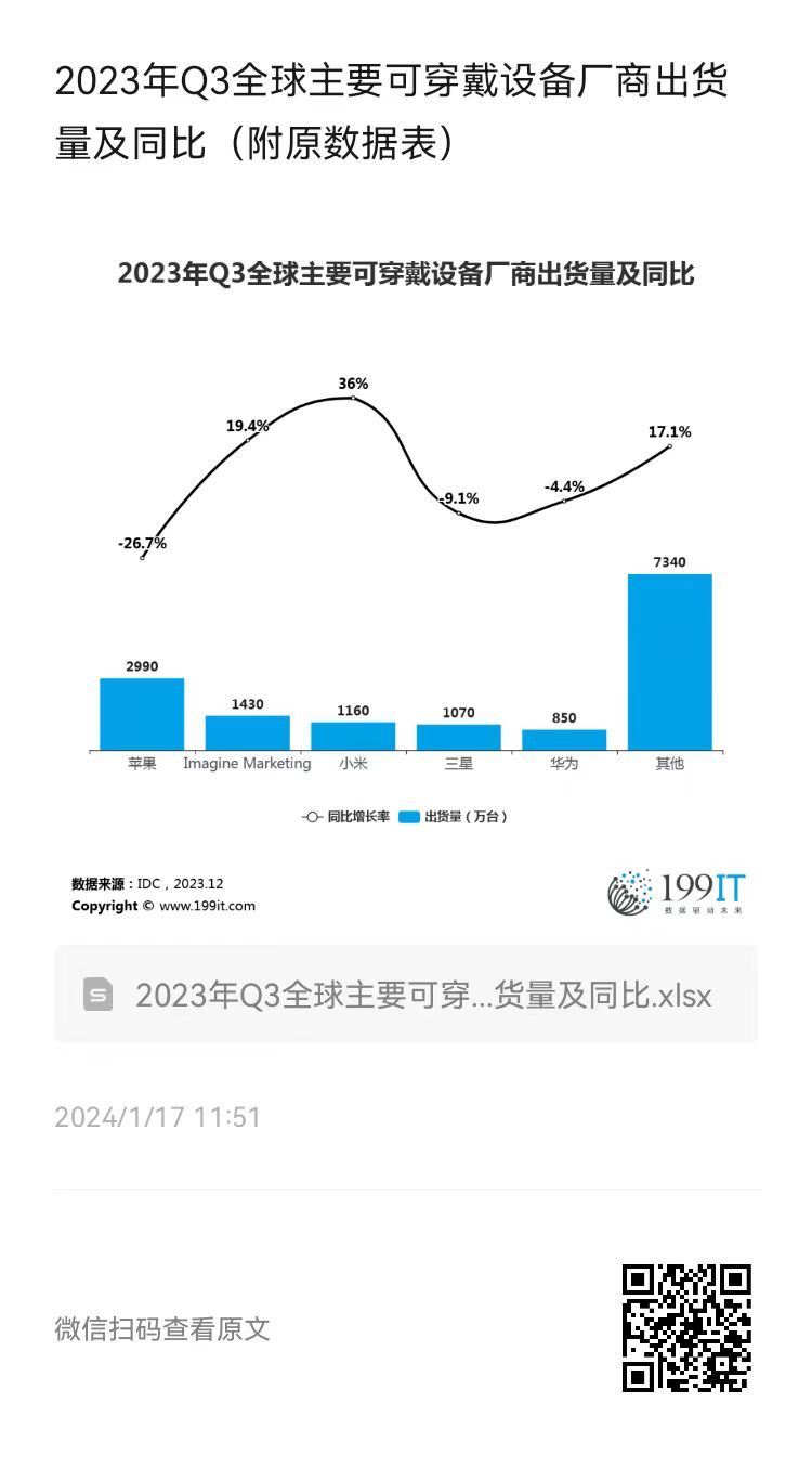- 2024年Q1全球主要可穿戴设备厂商出货量及同比(附原数据表)