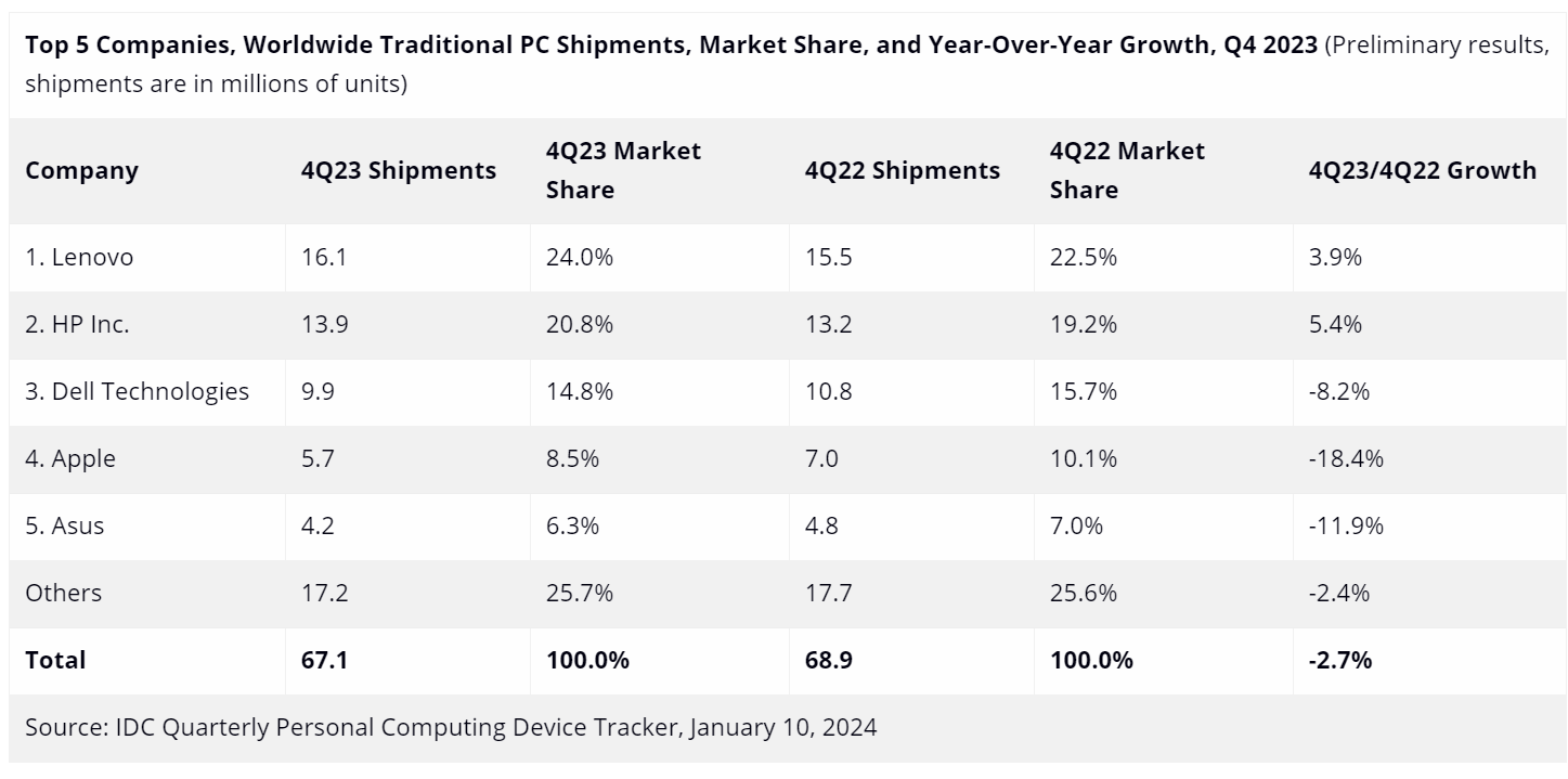 根据IDC对全球个人计算设备跟踪的初步结果,2023年第四季度全球传统PC出货量略高于预期,出货量近6710万台,比去年下降2.7%。市场萎缩似乎已经触底,预计将在2024年实现增长。