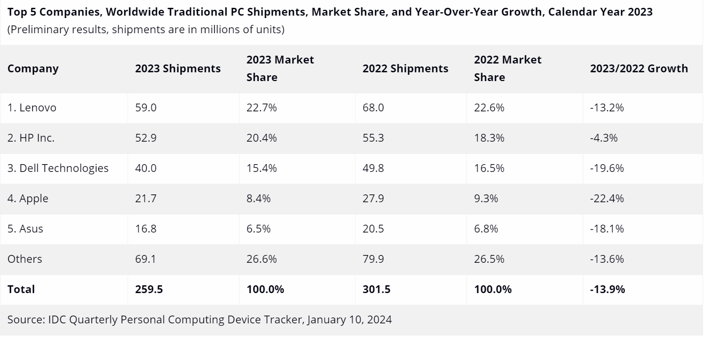 按年度计算,市场经历了前所未有的连续下跌,与1995年以来的历史趋势截然不同。2022年,出货量比前一年下降16.5%,初步结果显示,2023年将比2022年进一步萎缩13.9%。这种行业历史上前所未有的低迷反映了COVID-19大流行推动PC购买量大幅增长的后果。