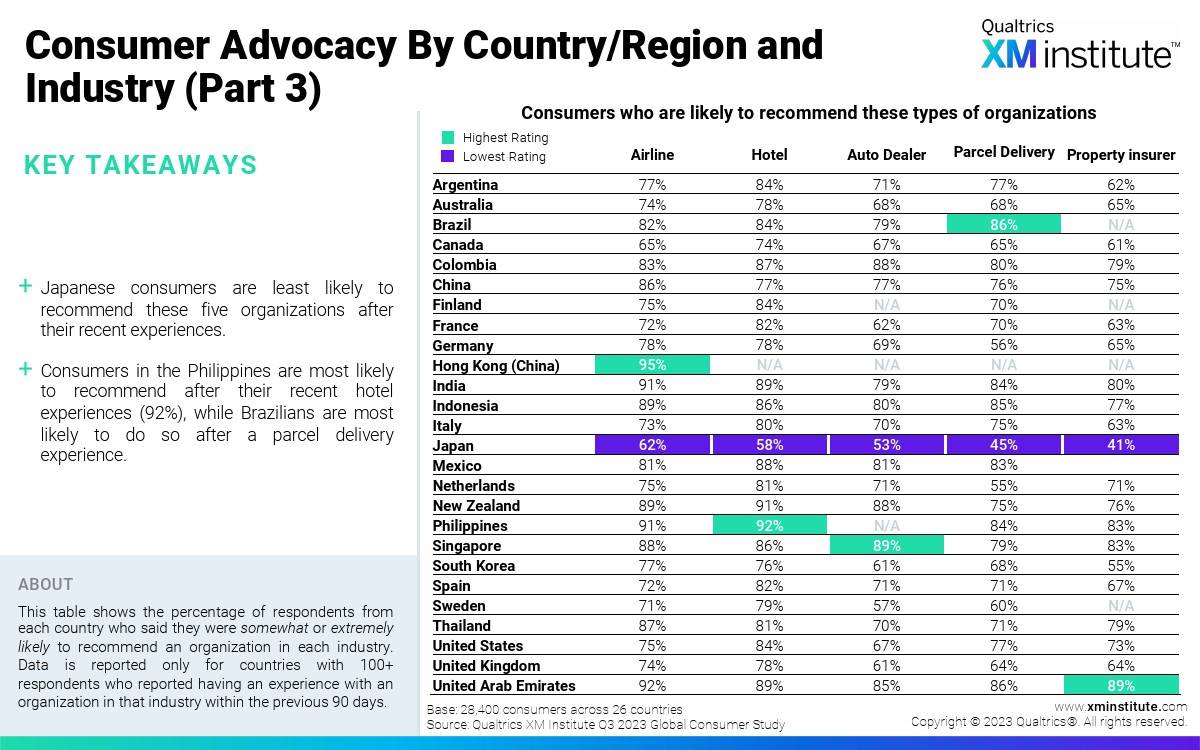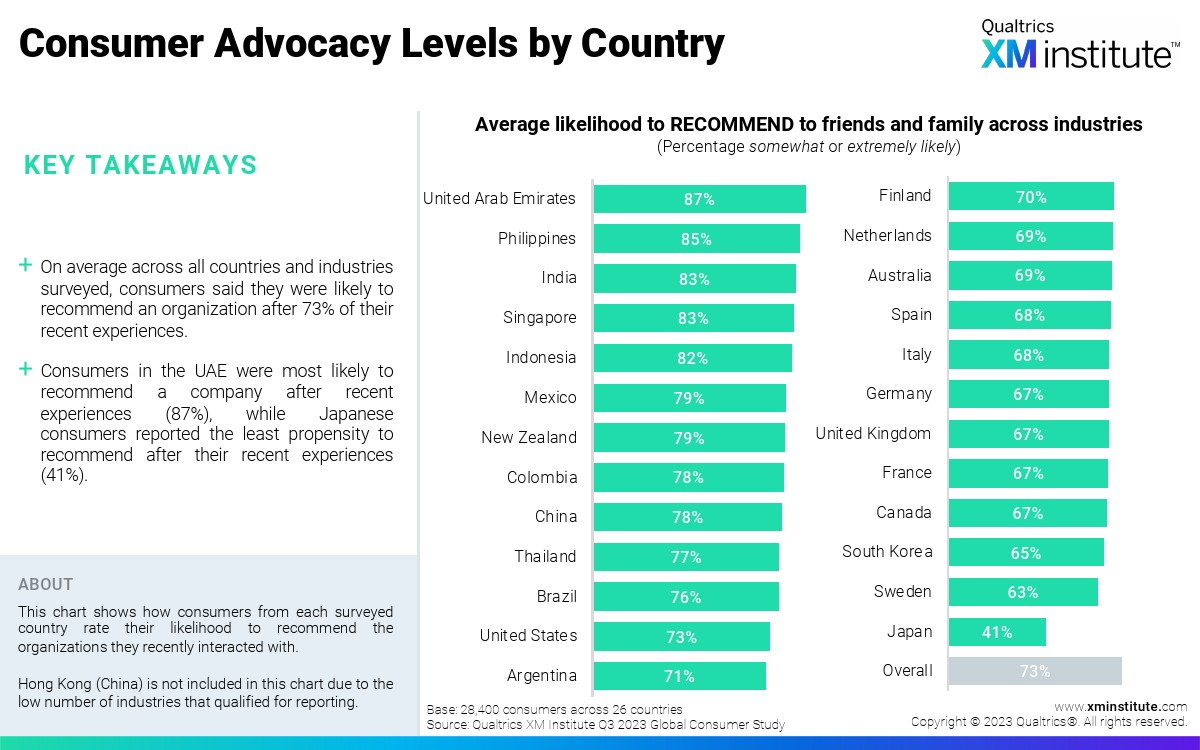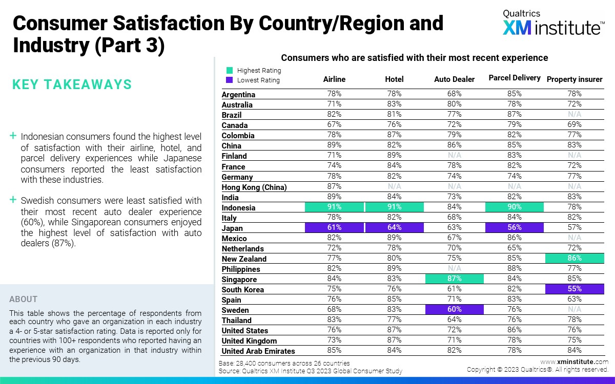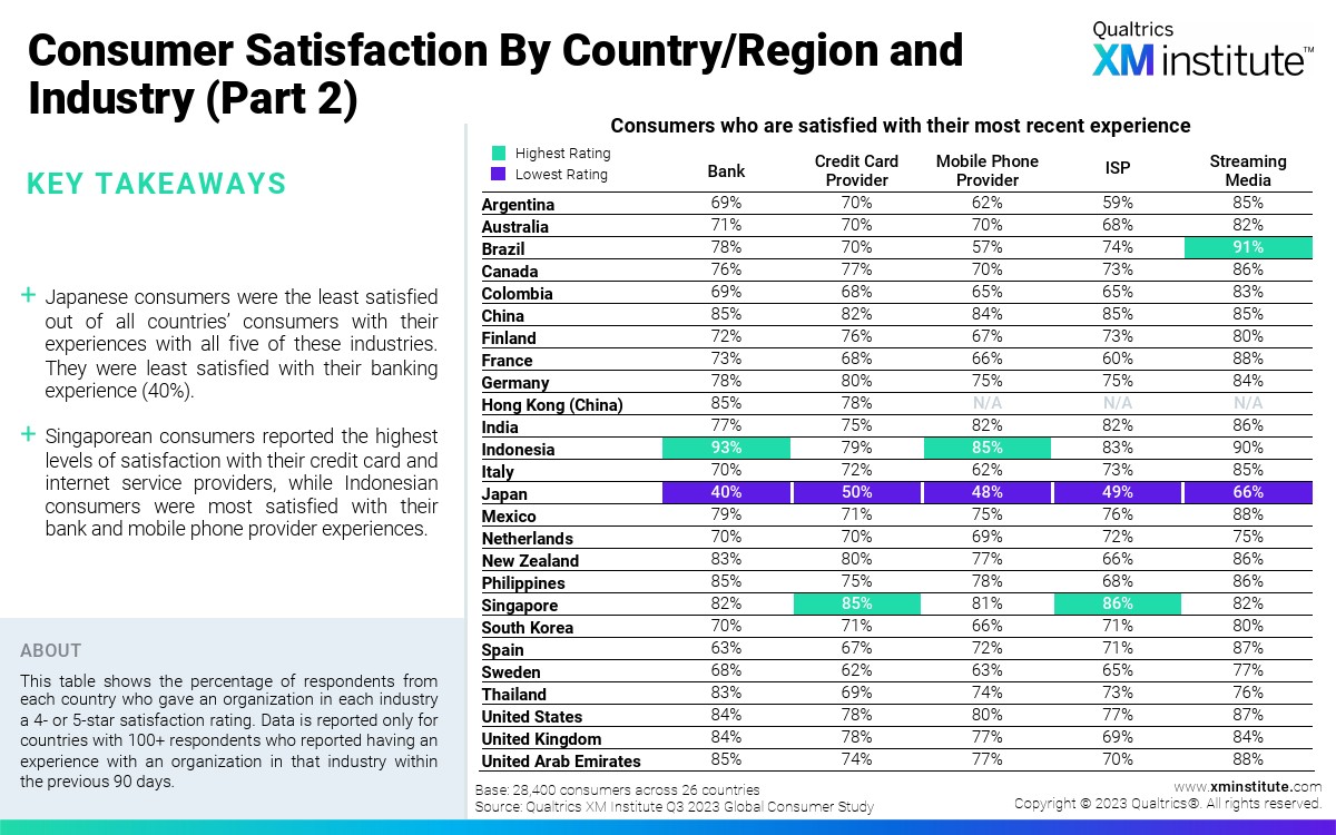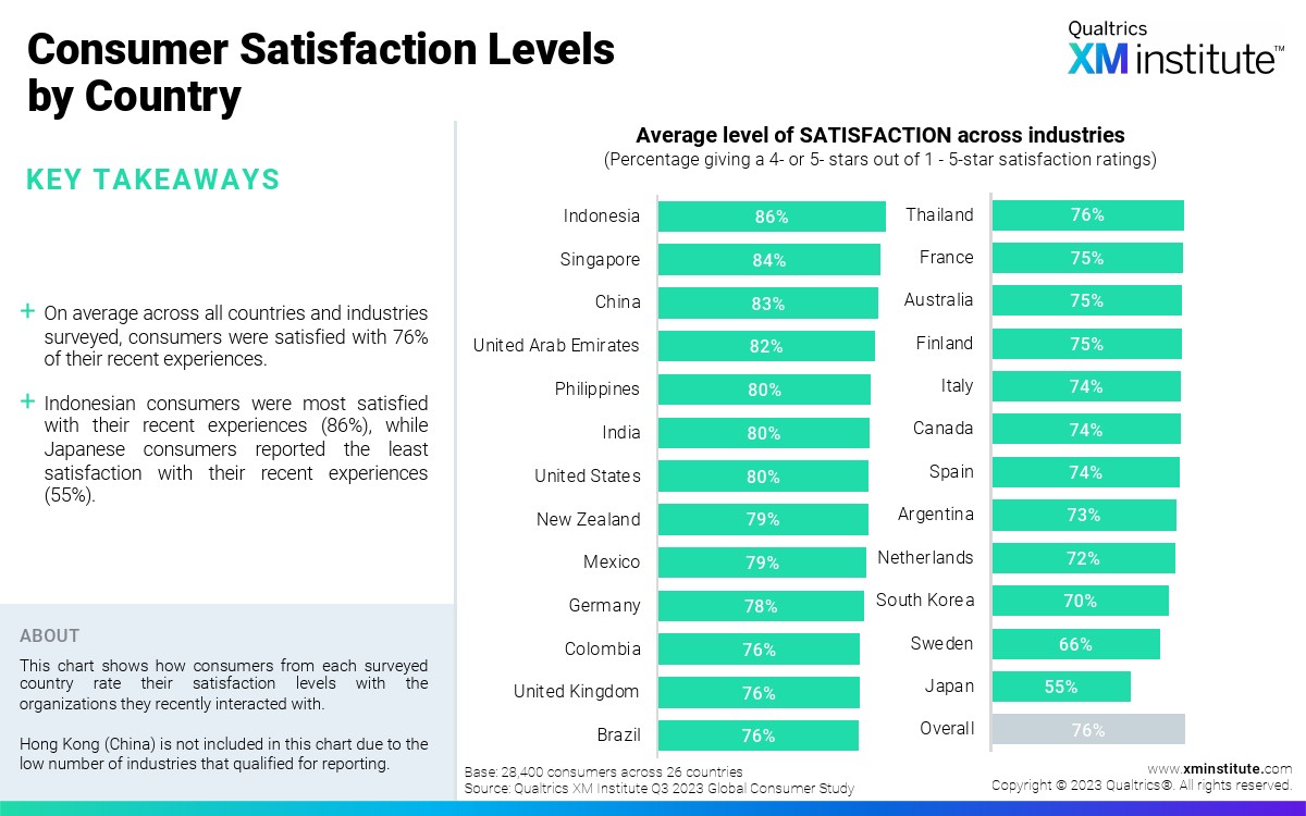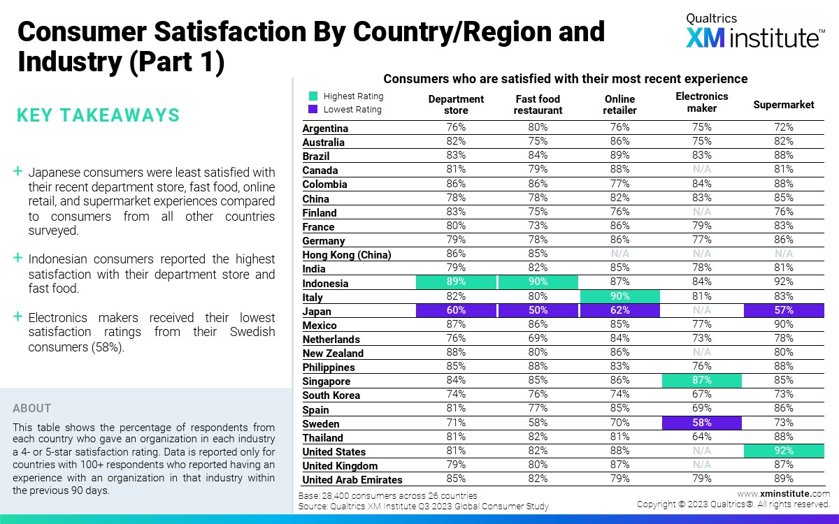 平均而言,80%的美国受访者表示,他们对自己最近在一家企业的体验感到满意,高于全球26个国家(76%)的平均水平。日本的平均评分较低,只有55%的受访者给自己最近在一家公司的经历打了4星或5星。