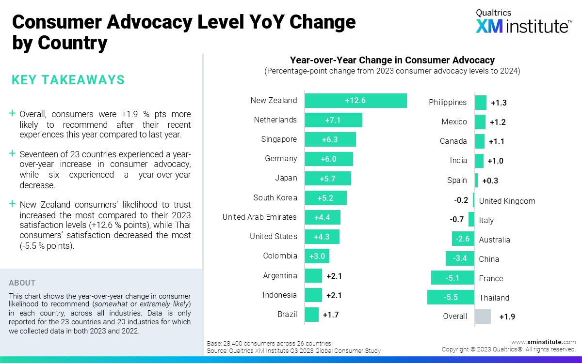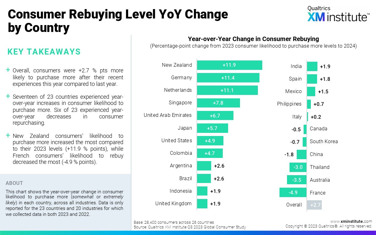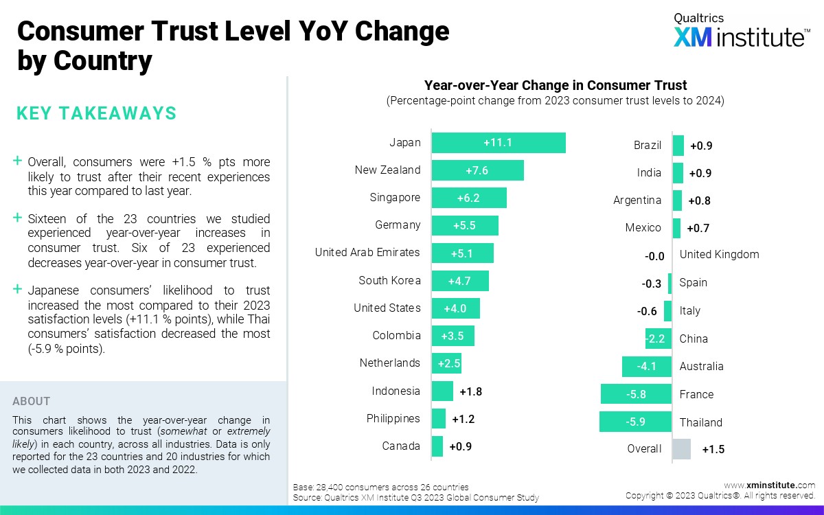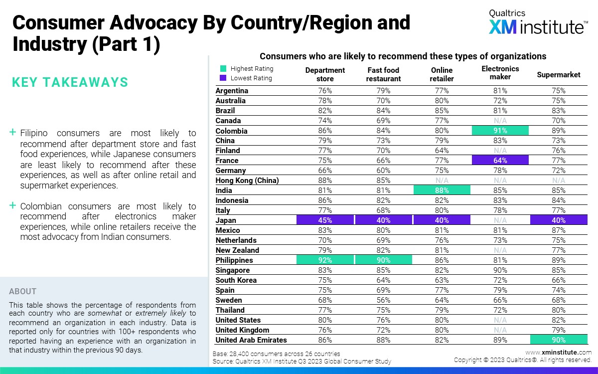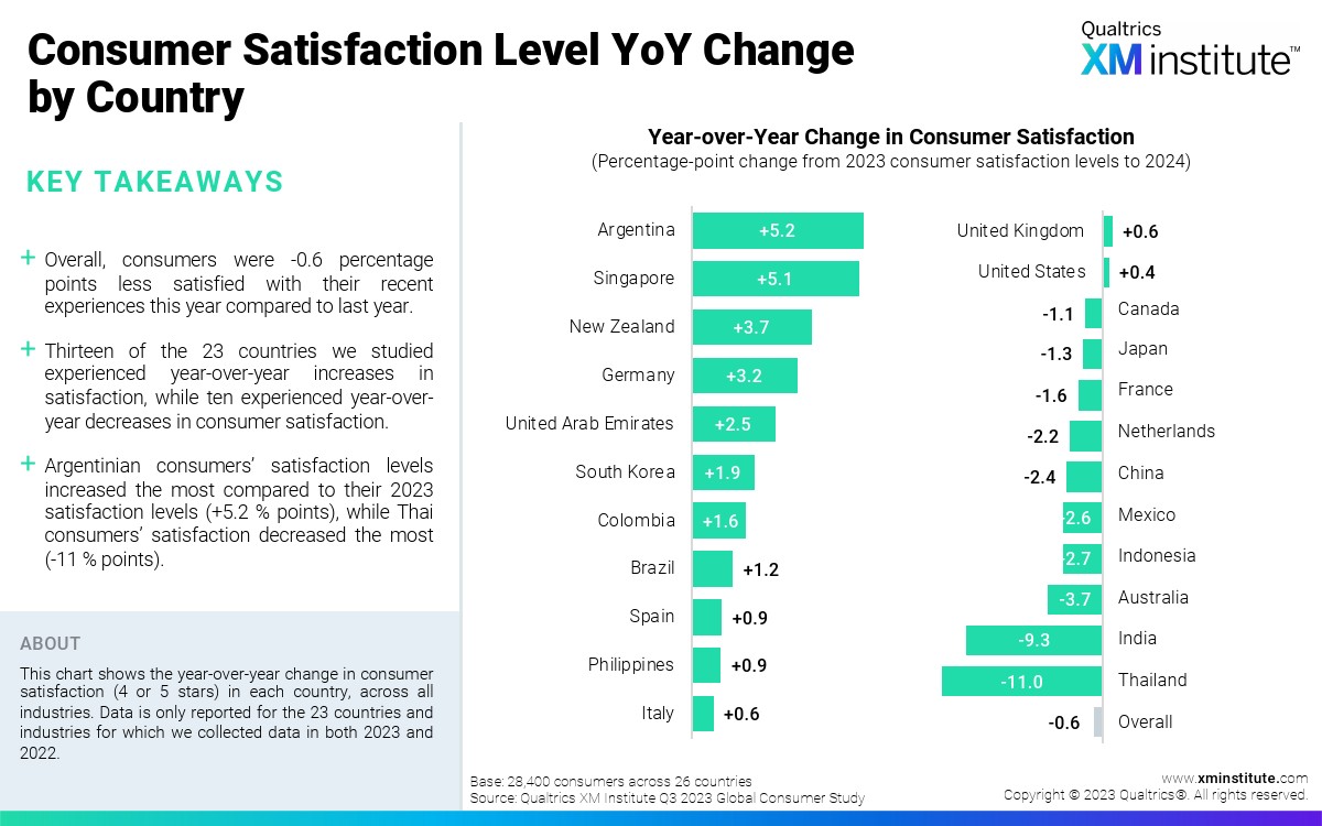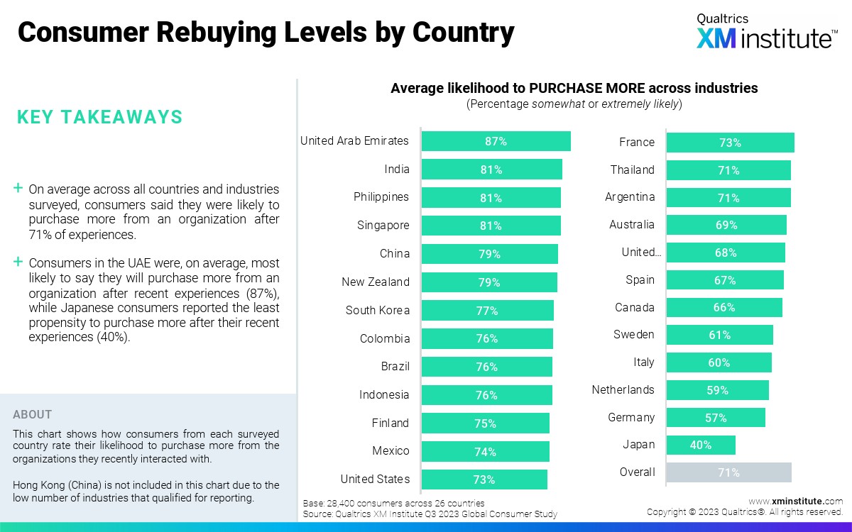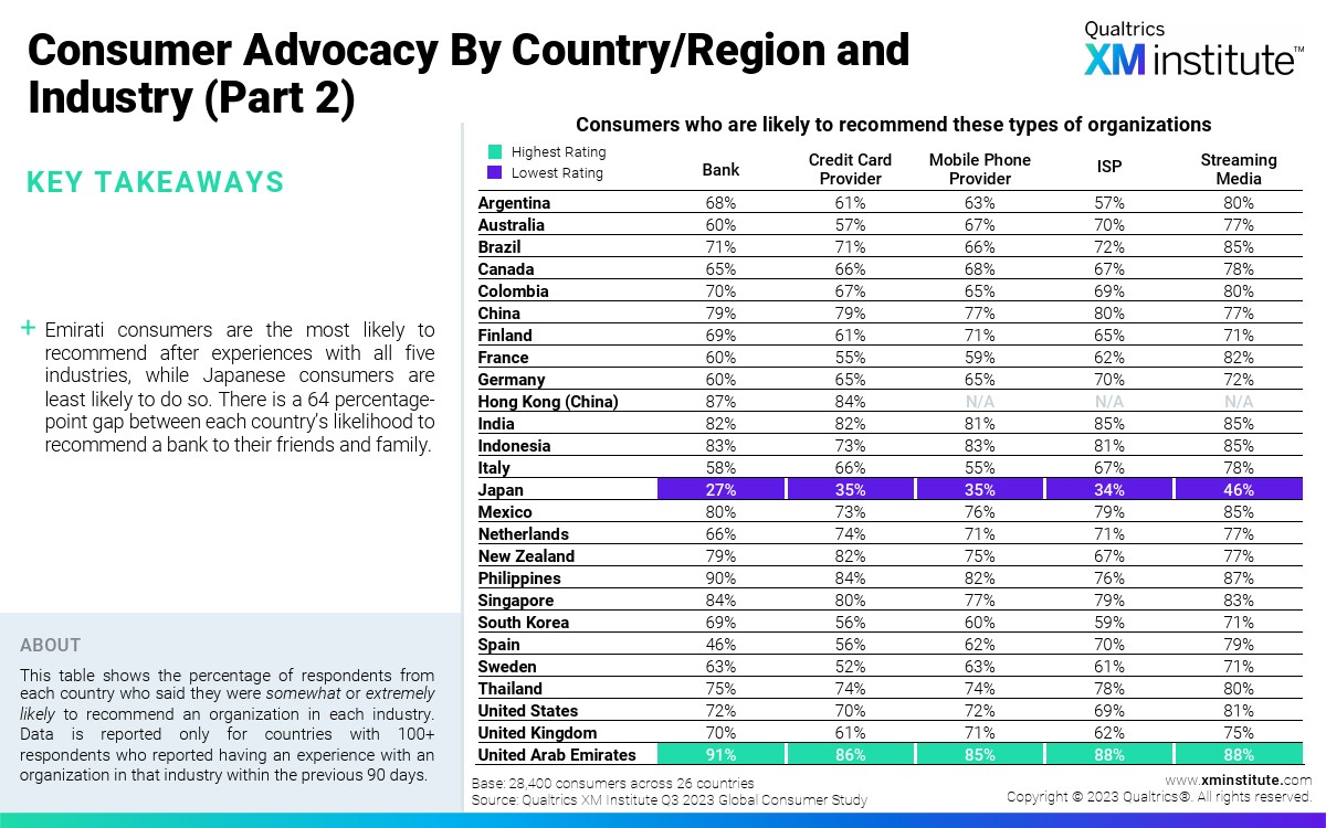 平均而言,80%的美国受访者表示,他们对自己最近在一家企业的体验感到满意,高于全球26个国家(76%)的平均水平。日本的平均评分较低,只有55%的受访者给自己最近在一家公司的经历打了4星或5星。