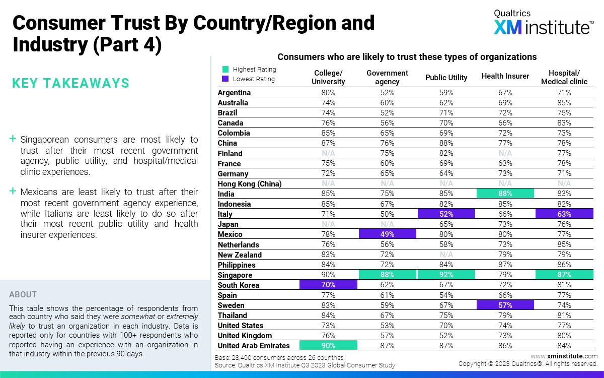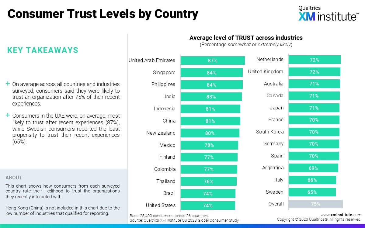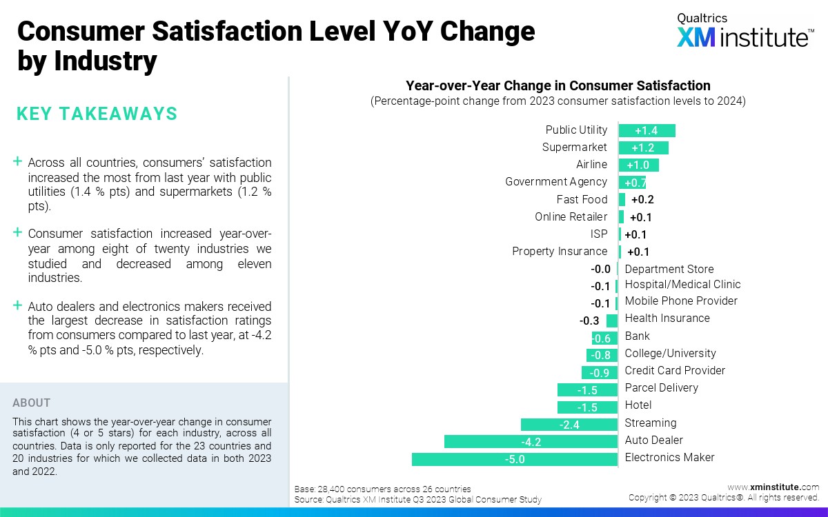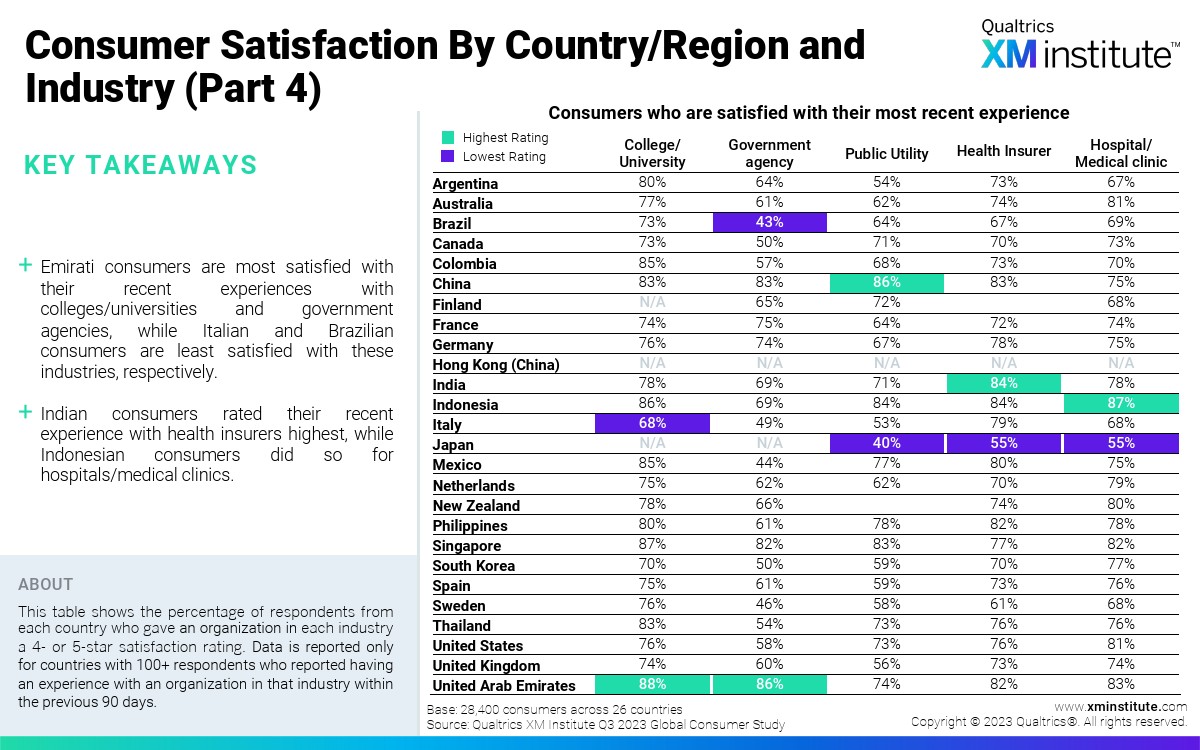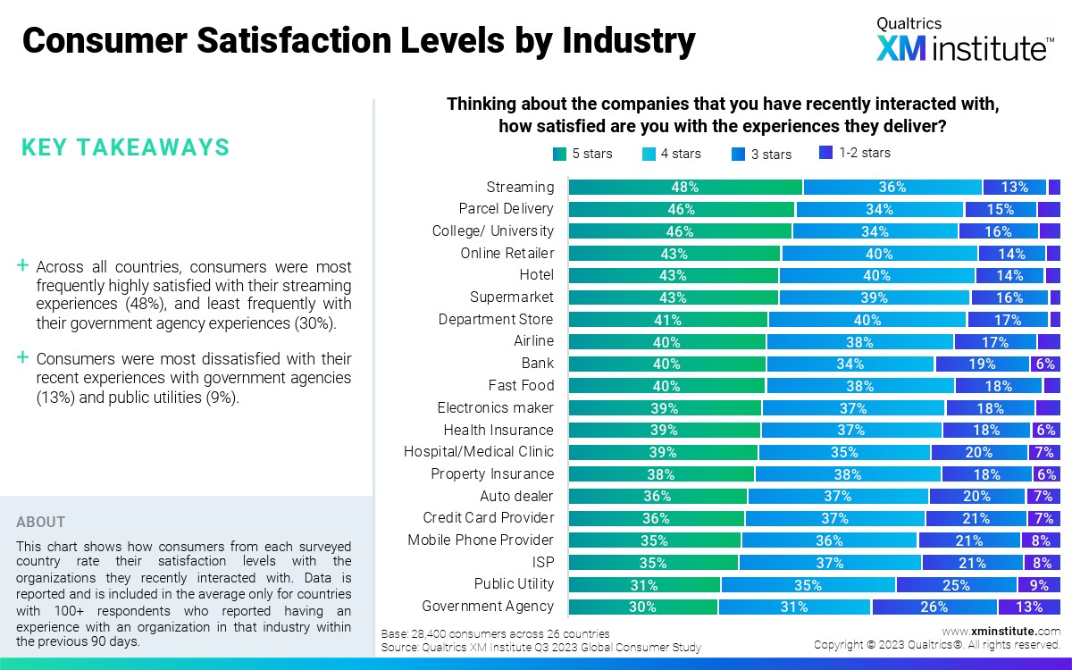 根据Qualtrics XM Institute的研究结果,美国消费者对超市的满意度最高,而对政府机构的满意度最低。根据这份报告,美国在各行业的平均满意度方面处于较高水平。