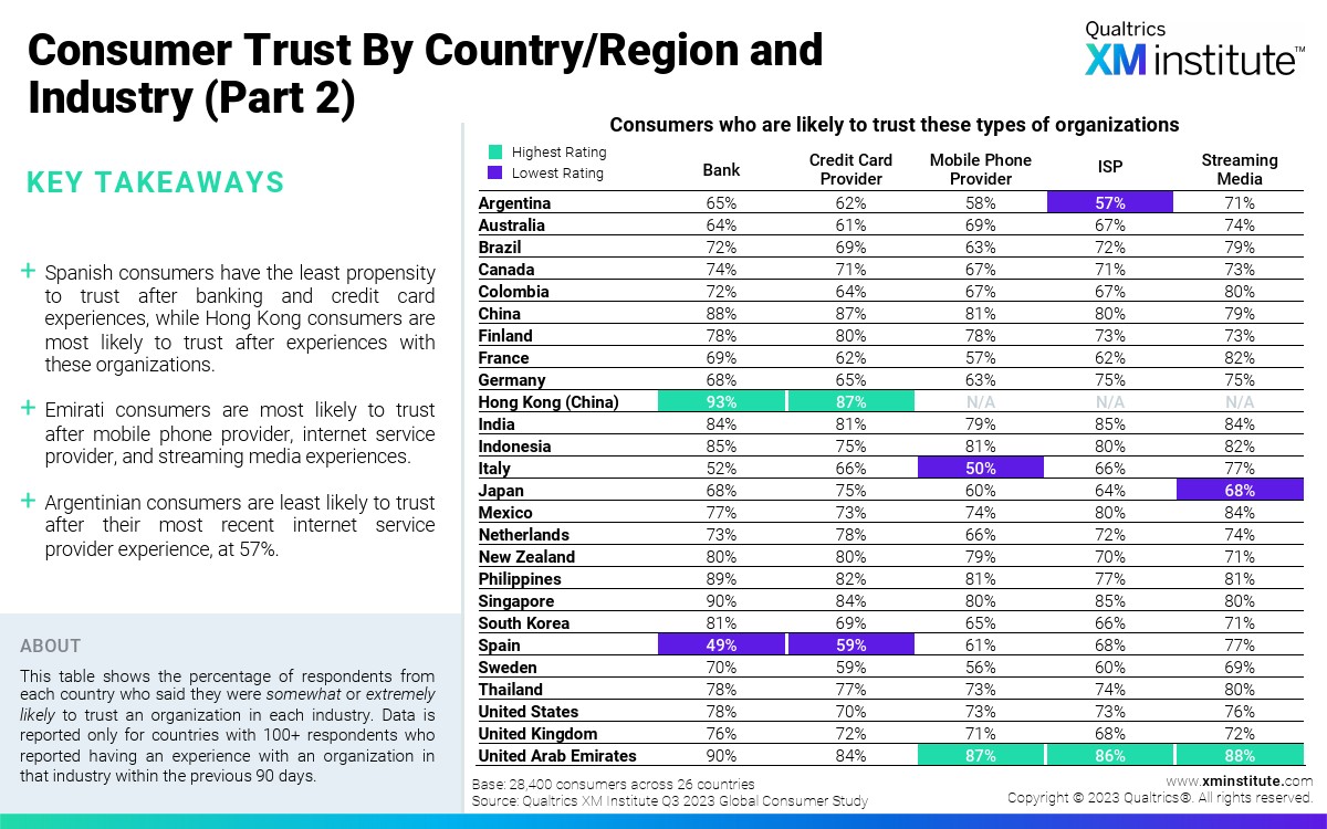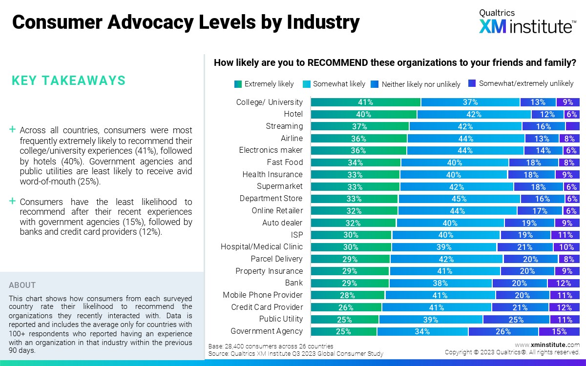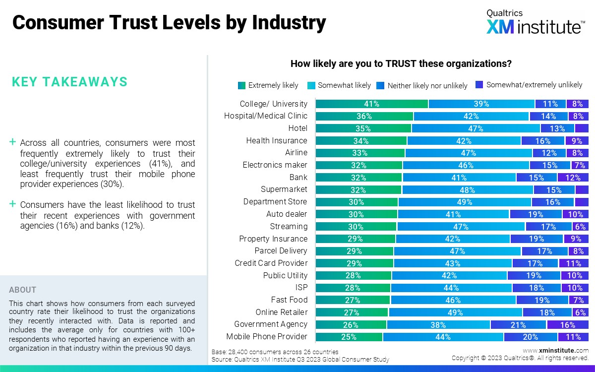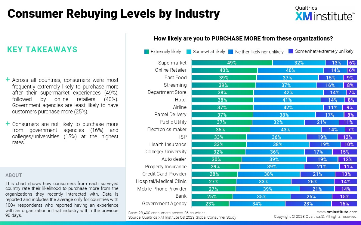 至于忠诚度,这对消费者来说变得越来越重要,美国受访者对超市(86%)和酒店(85%)的忠诚度最高,对政府机构(53%)和汽车经销商(63%)的忠诚度最低。