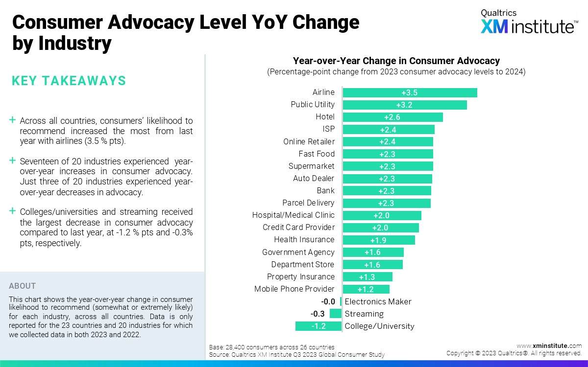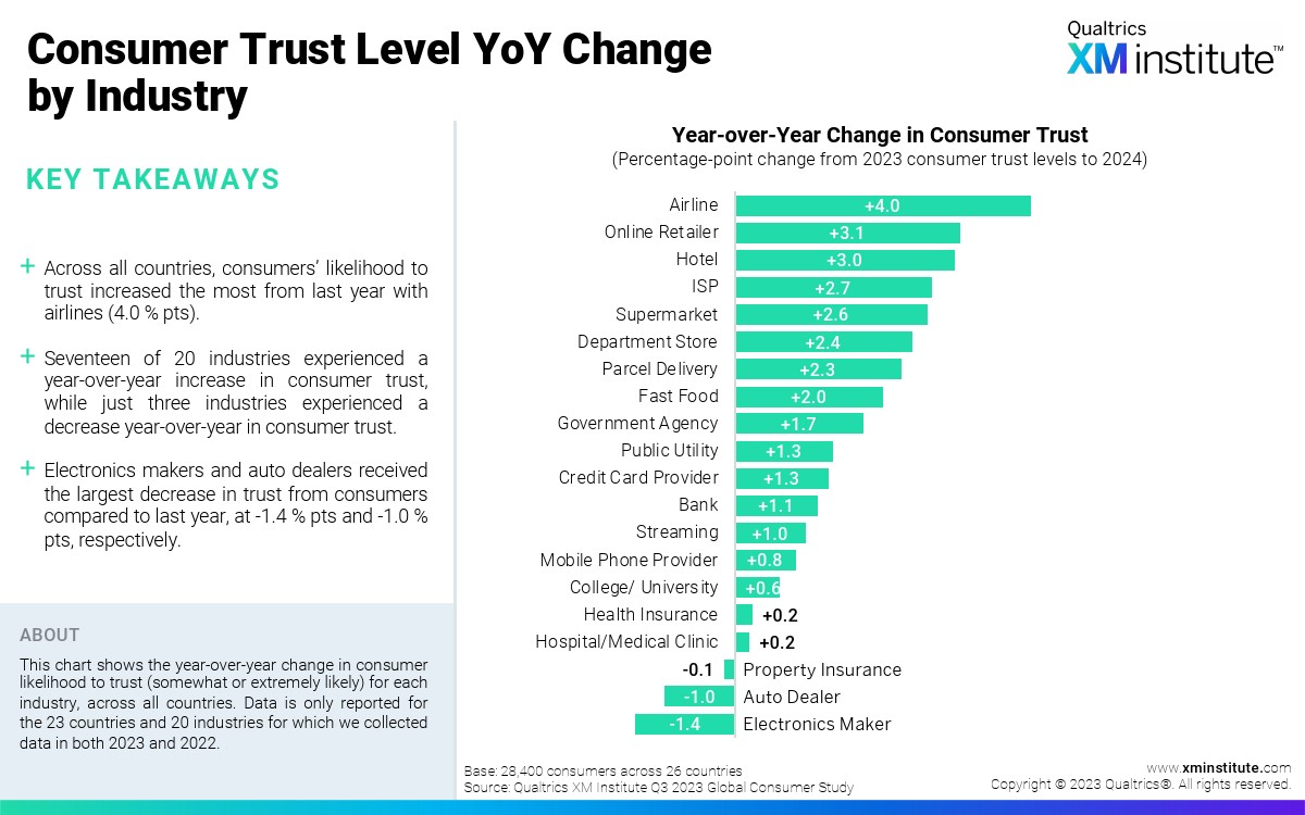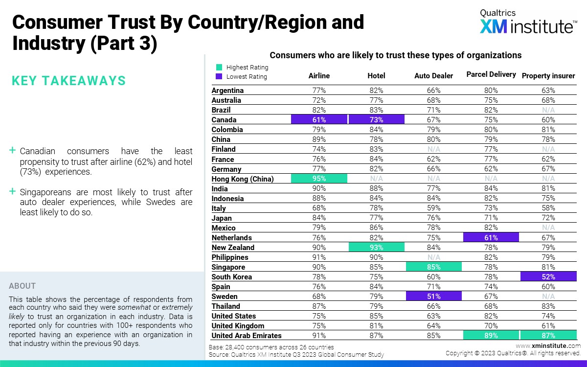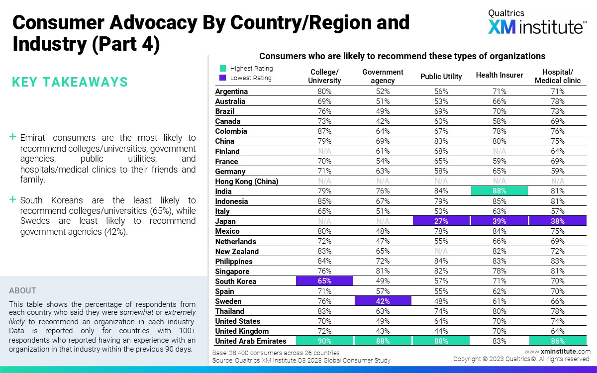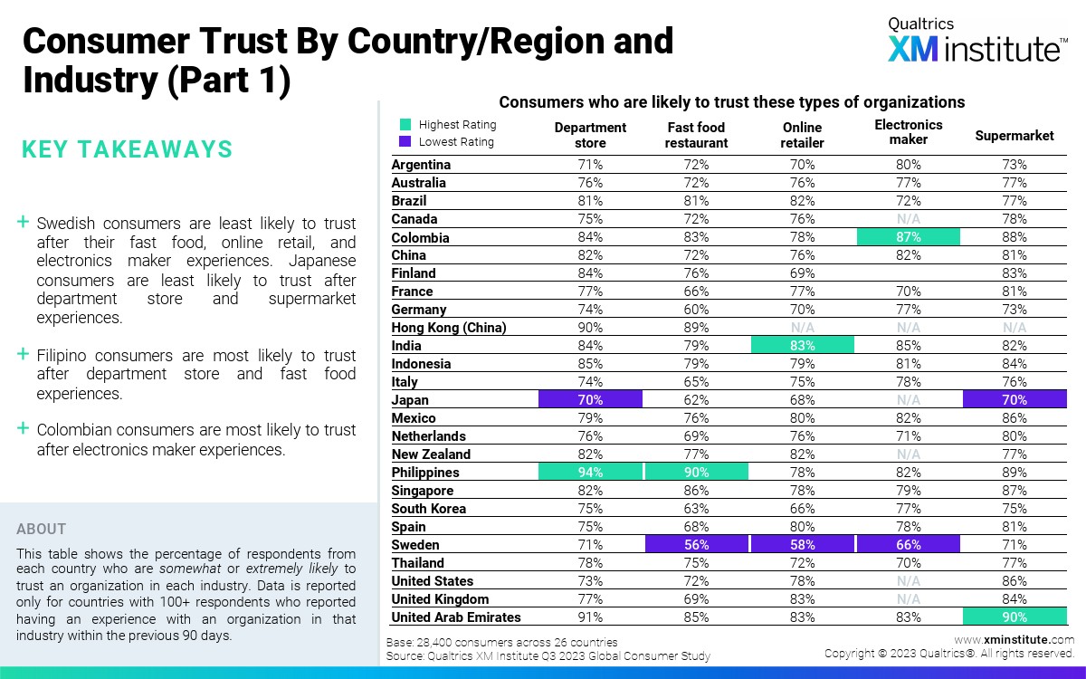 至于忠诚度,这对消费者来说变得越来越重要,美国受访者对超市(86%)和酒店(85%)的忠诚度最高,对政府机构(53%)和汽车经销商(63%)的忠诚度最低。