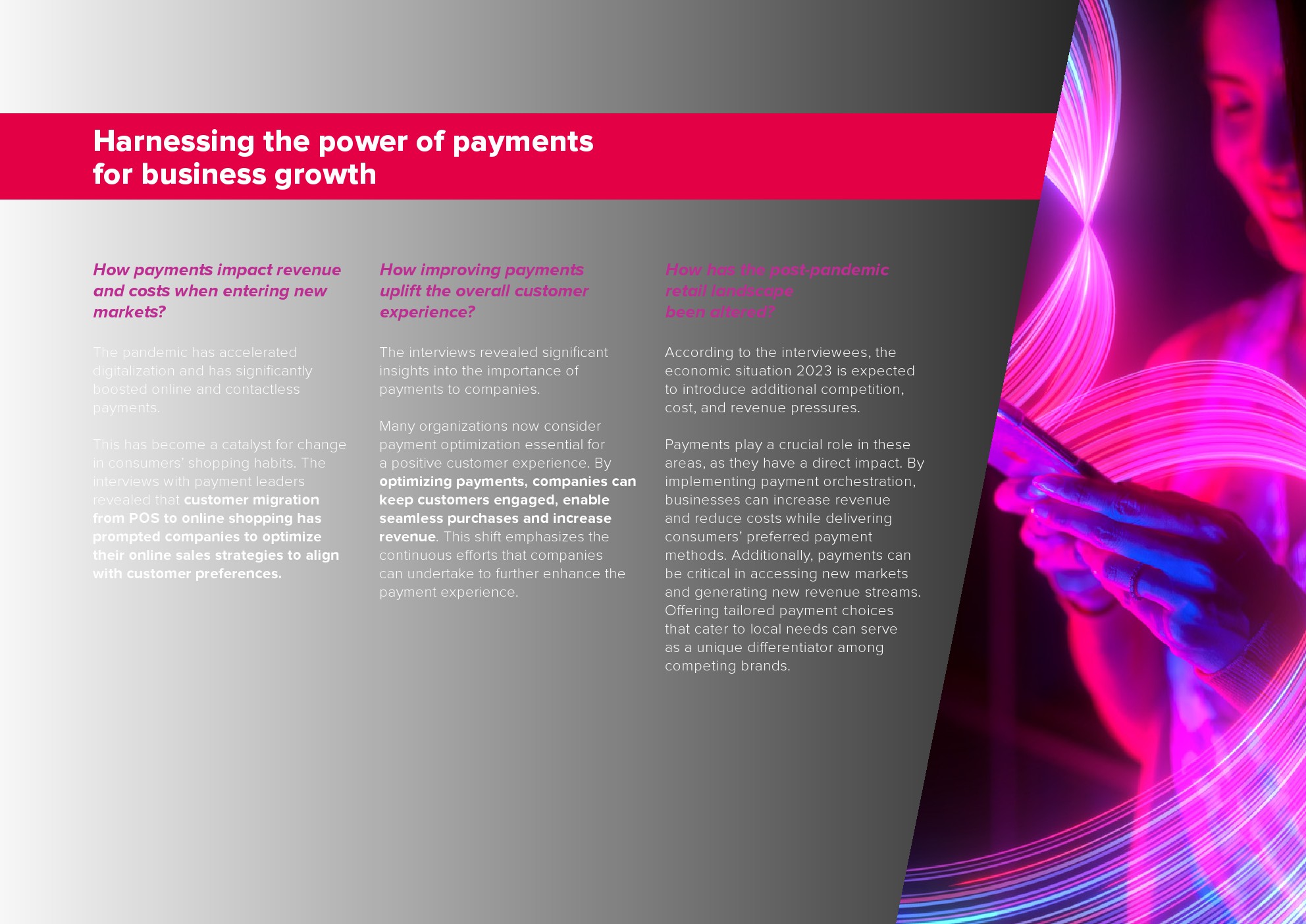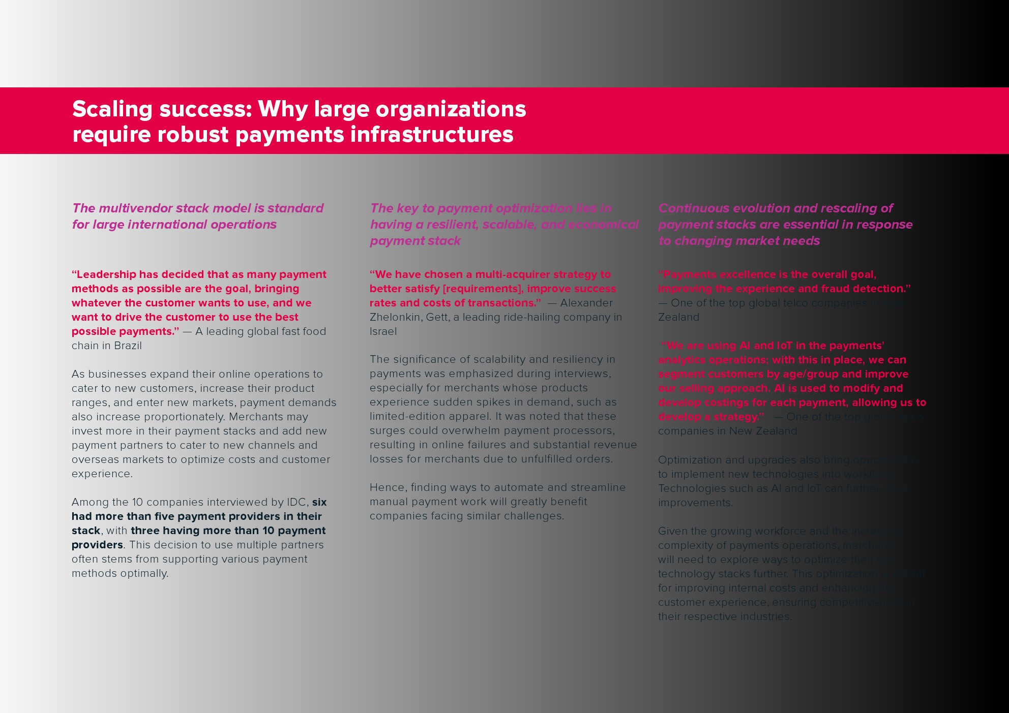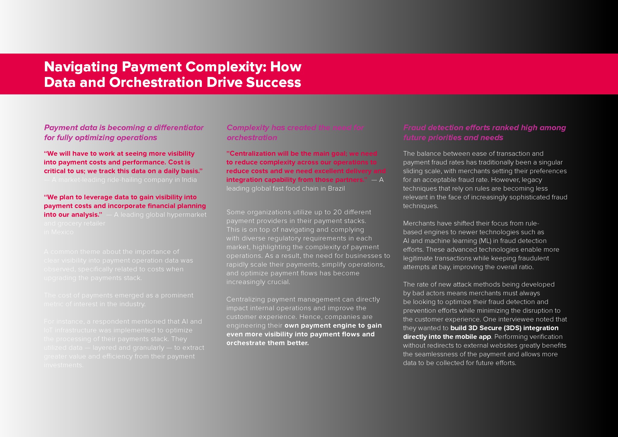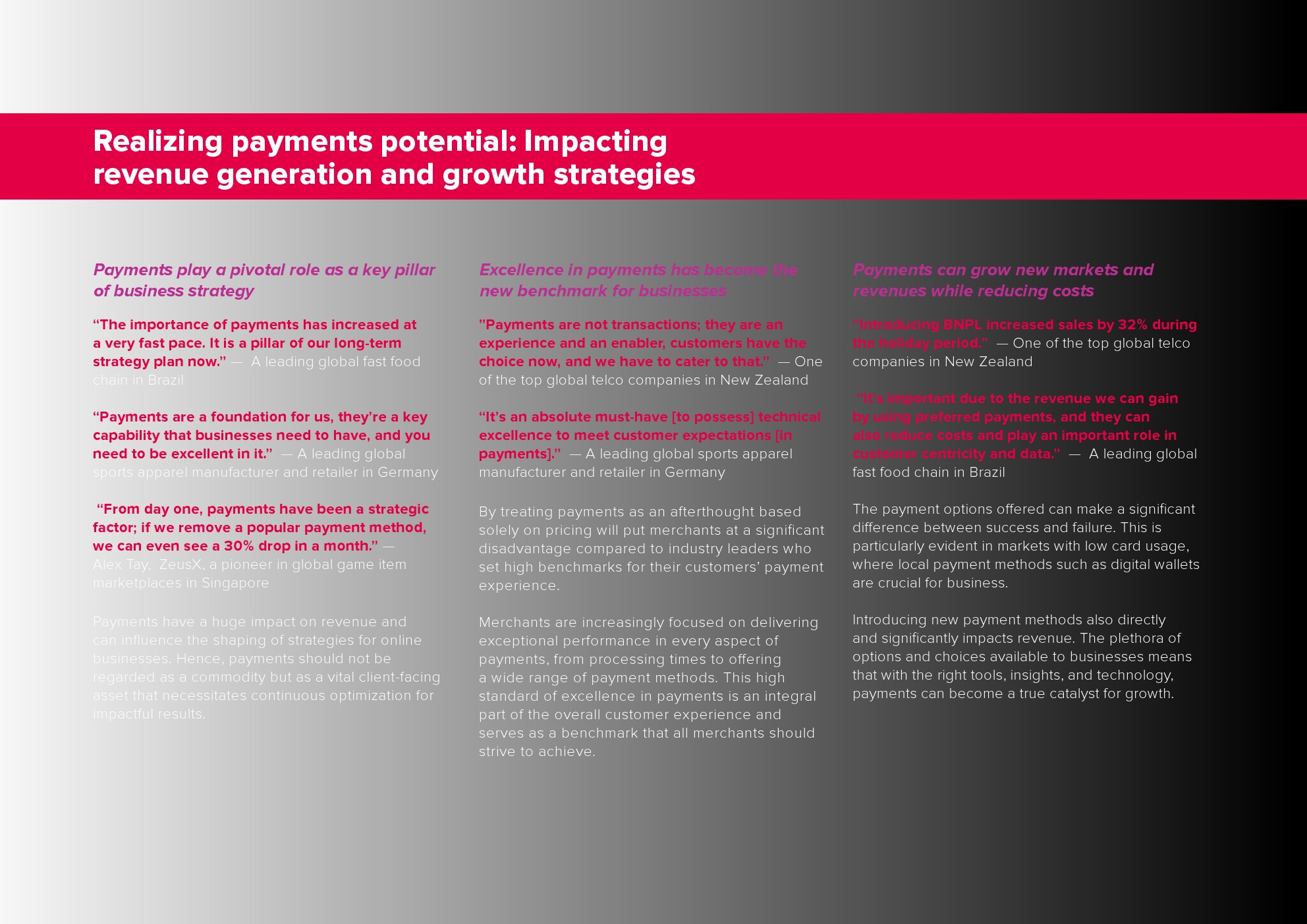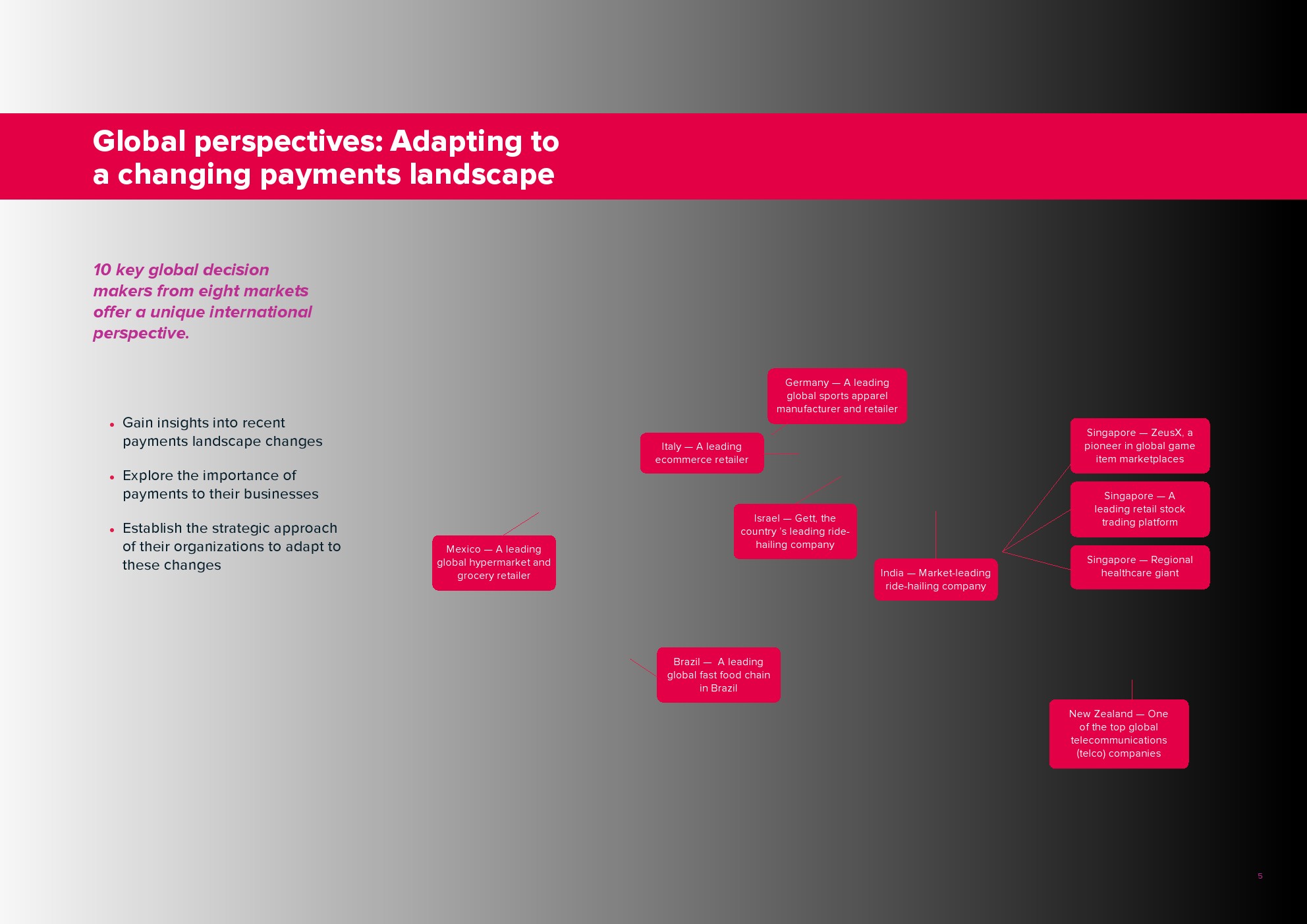 报告基于对10位行业领导者的深度访谈的见解,这些行业领导者代表着全球大型跨国公司和快速增长的科技公司。这些访谈深入探讨了互联支付时代的观点,以及企业如何在快速发展的支付环境中应对挑战。
