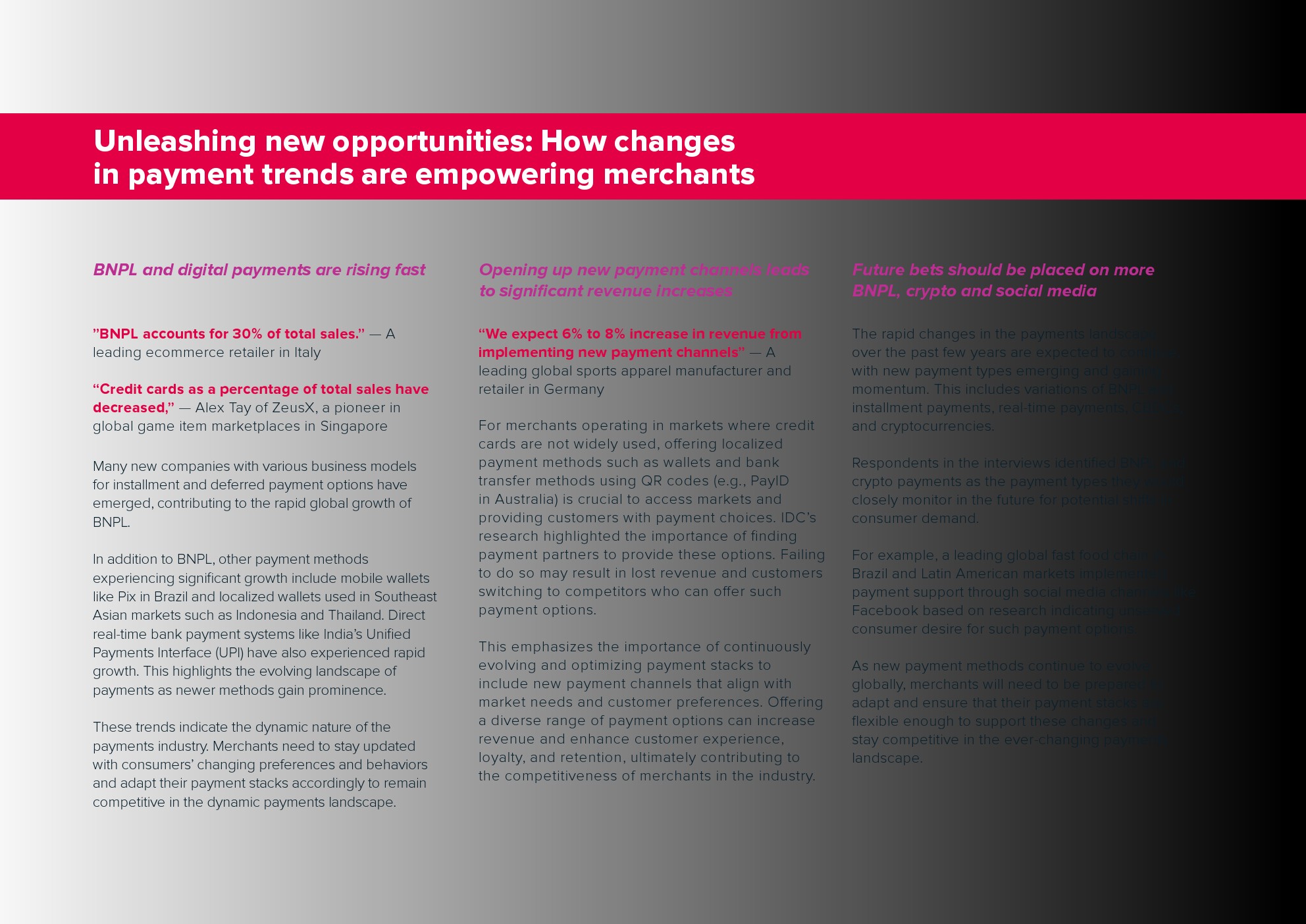 新支付方式的迅速出现为企业提供了重要的机会。IDC的访谈显示,激活新的支付渠道,如BNPL(先买后付),每月的收入增长可达32%。