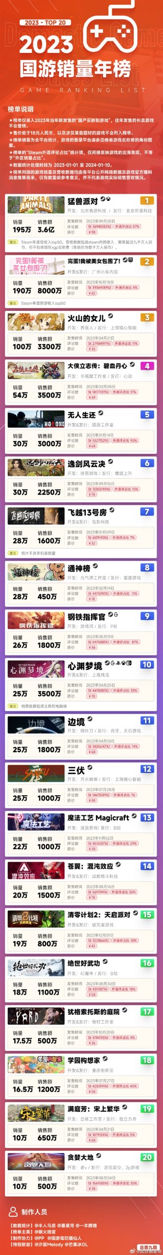 需要注意的是,榜单仅录入2023年当年新发售的“国产买断制游戏”,往年发售的长卖游戏不会登榜;同时售价低于18元、以及涉及某些题材的游戏不会列入榜单。