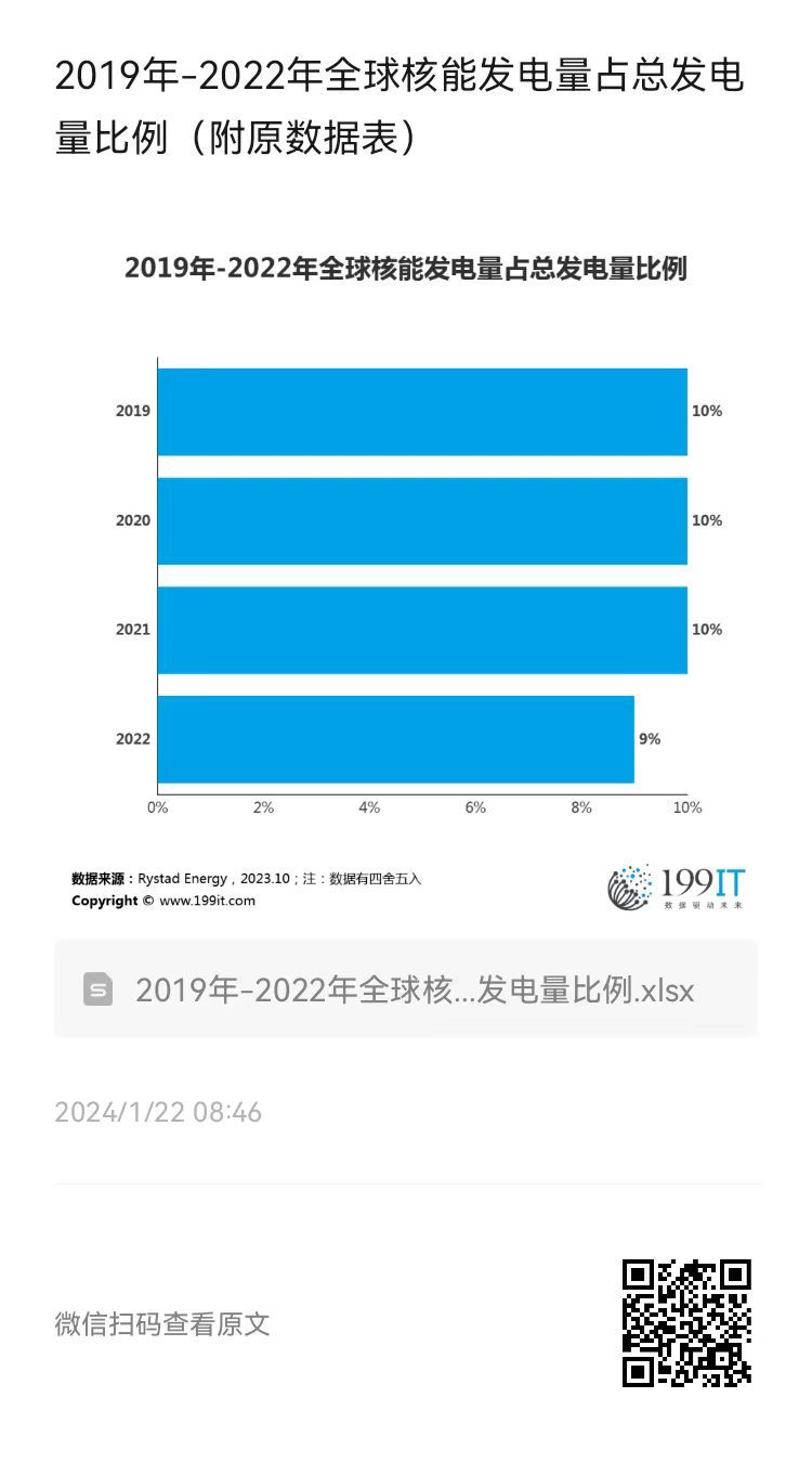 2019年-2022年全球核能发电量占总发电量比例(附原数据表) ​​​