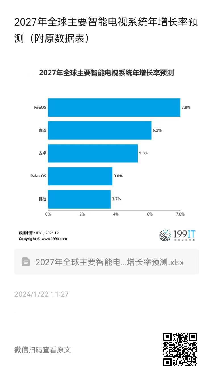 2027年全球主要智能电视系统年增长率预测(附原数据表) 更多阅读:2021年-2025年美国12岁以上消费者持有智能电视比例(附原数据表) 酷云互动:2020年3-4月智能电视全场景月度风向标酷云互动:2020年1-2月智能电视全场景月度风向标酷鹅用户研究院:2018年中国智能电视用户洞察报告Hub Entertainment:研究显示智能电视将成为家庭娱乐中心研究:智能电视、流媒体播放器的观看习惯相似勾正数据:2020年8月智能电视大数据月度报告勾正数据:2020年7月智能电视大数据报告酷云互动:2019年4月智能电视全场景月度风向标酷云互动:2019年4月智能电视广告营销月度洞察报告勾正数据:2019年4月智能电视大数据报告酷云互动:2019年3月智能电视全场景月度风向标Strategy Analytics:2018年智能电视售出1.57亿台Strategy Analytics:2018年全球智能电视销量达到1.57亿台尼尔森网联:2019智能电视服务运营发展报告–信息图