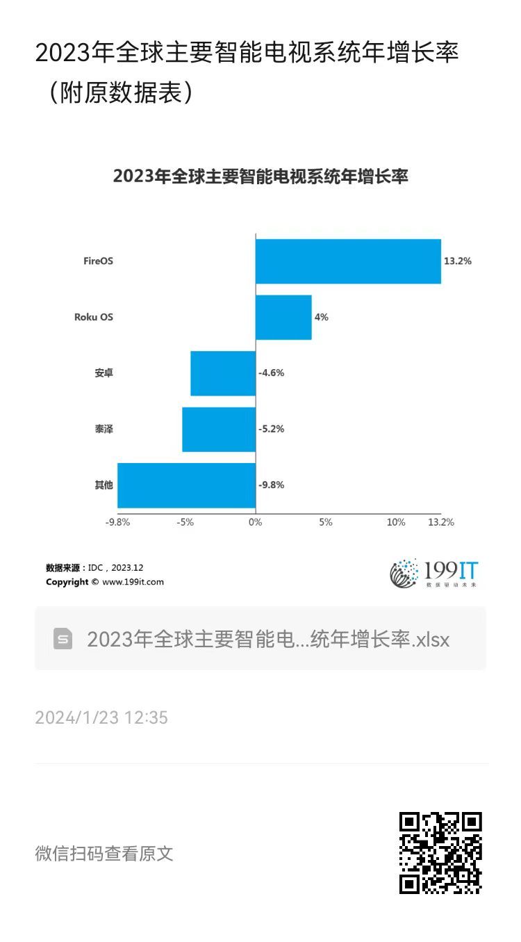 2023年全球主要智能电视系统年增长率(附原数据表) ​​​