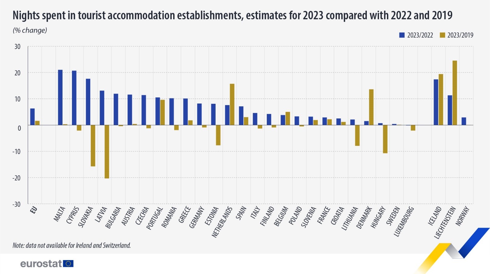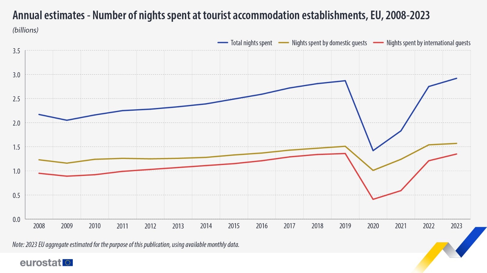 2023年在欧盟旅游住宿场所度过的夜晚数达到29.2亿晚,比2019年大流行前的水平(28.7亿晚)高出1.6%,创下了欧盟住宿的新纪录。
