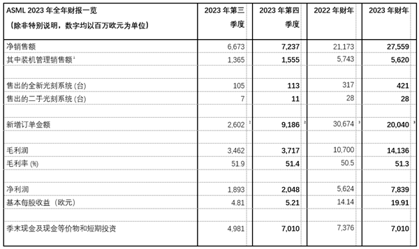 2023年第四季度,ASML净销售额72亿欧元(¥561.0亿),高于预期,毛利率51.4%,净利润达20亿欧元(¥155.8亿)。