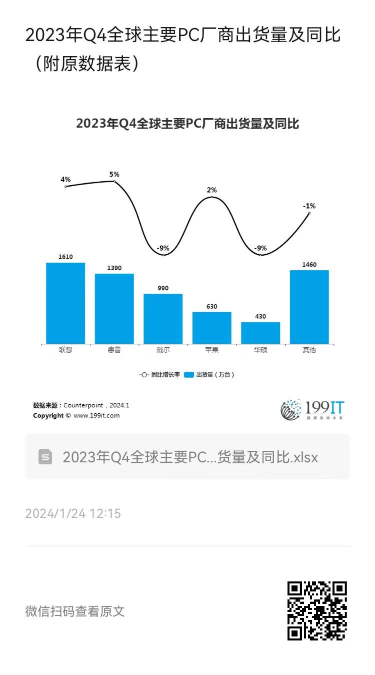 2023年Q4全球主要PC厂商出货量及同比(附原数据表) ​​​