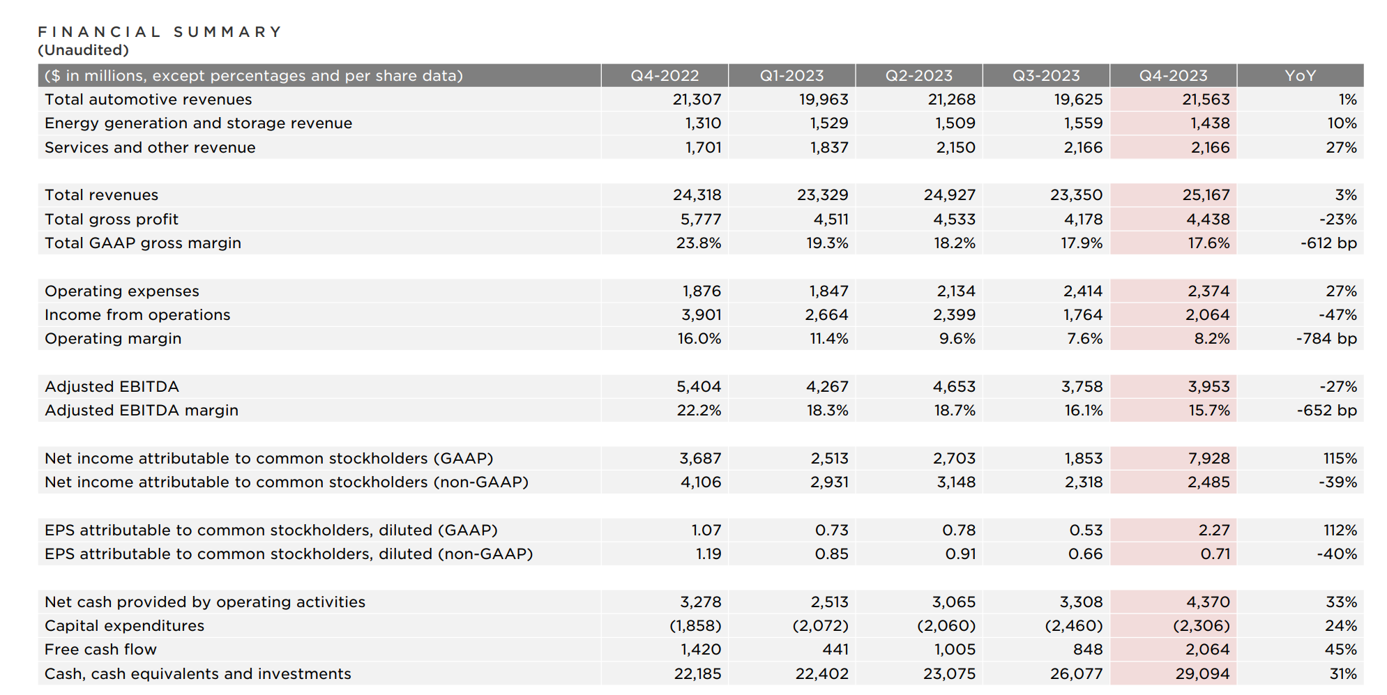 根据这份财报,特斯拉第四财季营收251.7亿美元,较上年同期的243亿美元增长了3%,但低于分析师预期的258.7亿美元;调整后每股收益(EPS)为0.71美元,分析师预期0.73美元;第四财季自由现金流20.6亿美元,分析师预期14.5亿美元。