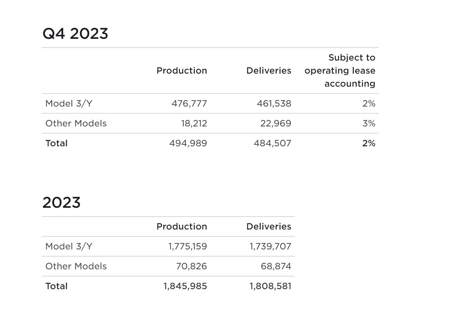 另一方面,特斯拉Q4汽车产量为494,989辆,较上年同期的439,701辆增长13%;交付量为484,507辆,较上年同期的405,278辆增长20%。