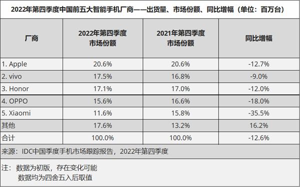 作为对比,2022年Q4排名前5的手机品牌分别是:苹果(20.6%)、vivo(17.5)、荣耀(17.1%)、OPPO(15.6%)、小米(11.6%)。