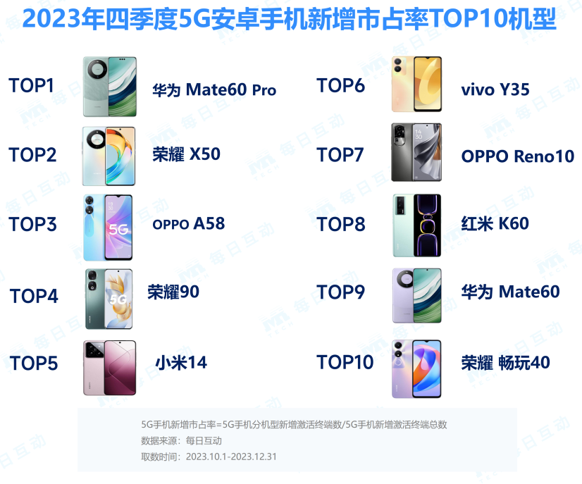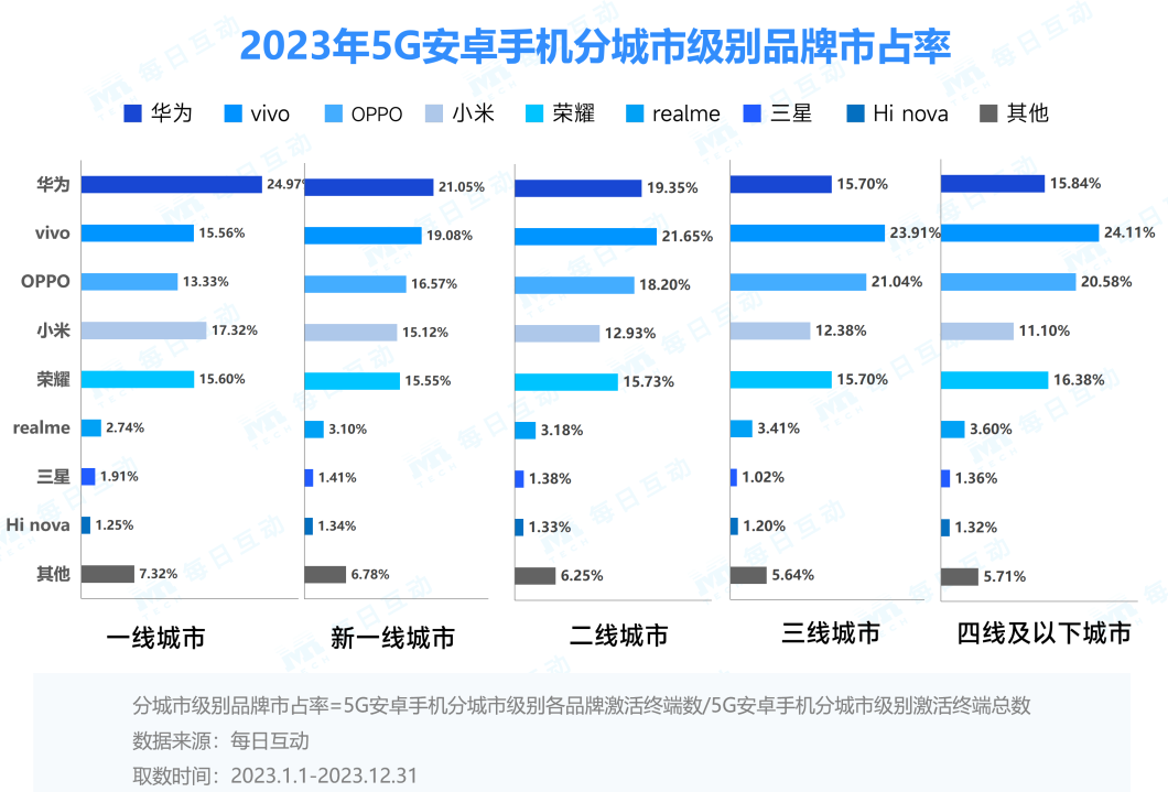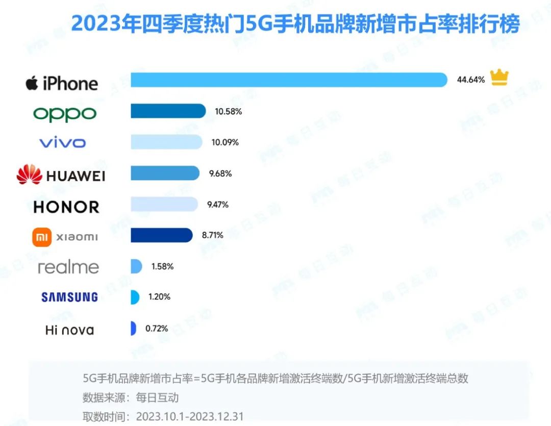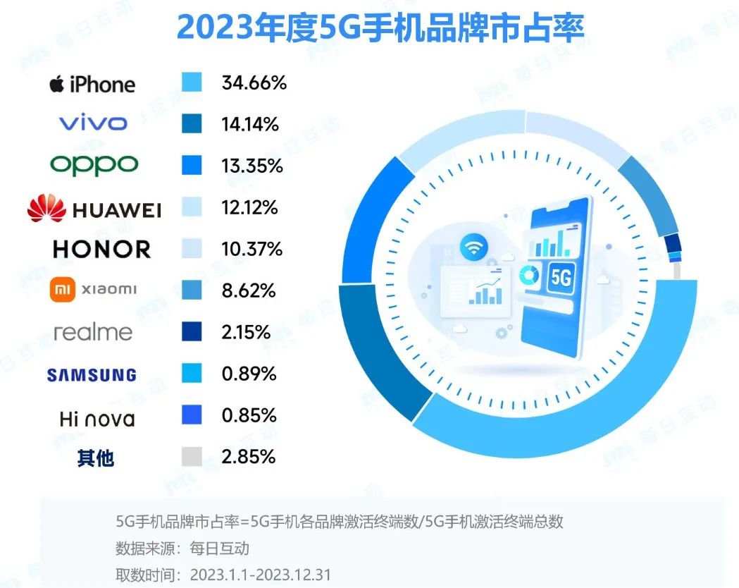 每日互动大数据统计了2023年四季度内新增的5G手机活跃设备市占率,并进行了排行。