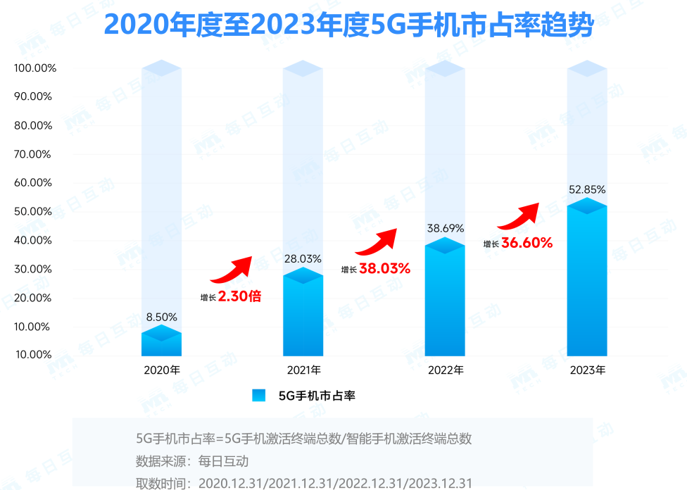 5G手机在智能手机市场的占有率达52.85%。5G手机自2019年年中正式面世到2023年底,用了四年半的时间就占据智能手机市场领先位置。