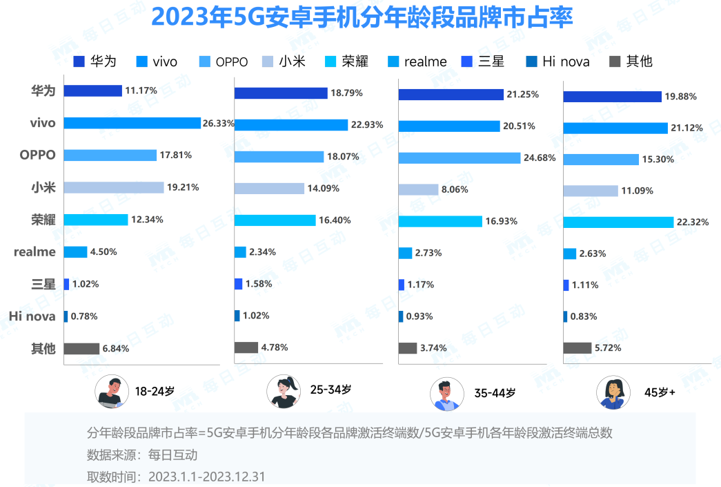 在35-44岁年龄段中,OPPO 5G手机品牌市占率达24.68%,排名第一。在45岁及以上年龄段用户中,荣耀5G手机市占率达22.32%,继续保持第一位置。