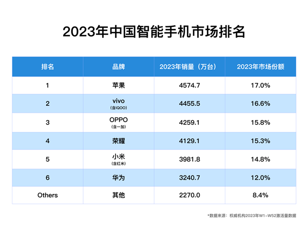 2023全年出货量市场份额排名:苹果、vivo、OPPO、荣耀、小米